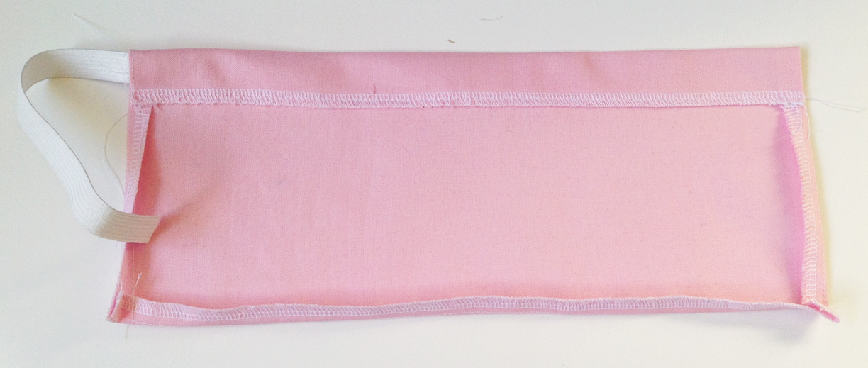 Move the elastic off the pocket and fold the top edge down about an inch to the wrong side. Stitch down using a 1/4″ seam allowance. Insert a safety pin through the free end of the elastic.