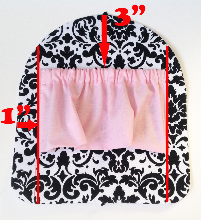 On the right side of that panel, measure and draw a line 1″ in from each side edge. Place your pocket on the panel 3″ from the top and then align the side edges with those vertical lines you drew. Create pleats with the excess fabric along the bottom, or do what I do and just slap your hot iron down on it and let the folds fall where they may!