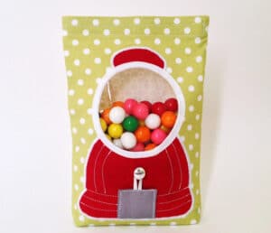 What is more fun than a gumball machine treat bag? One that really dispenses! This easy applique project features a clear window that reveals the treats inside and a little door that opens to free them! The velcro closure at the top allows for easy filling. Customize fabrics to suite any occasion.