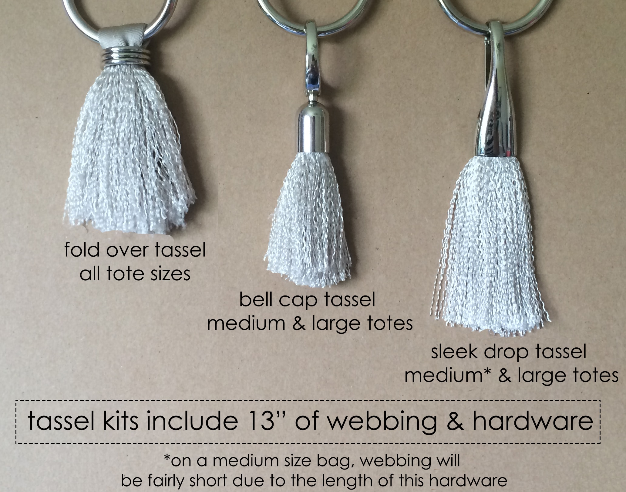 There are 3 different kits available. Fold-over tassels kits come with 14″ of webbing in your choice of color. Bell Cap & Sleek Drop kits include 9″ of webbing. If you are adding the tassel to a Market Tote please read the options below to determine which best suits the size tote you are making. Need a piece of hardware to hang your tassel on? Click here.