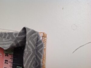 Flip the binding up and fold it so there is a 45º angle into the corner. The edges of the Binding and the Wrap should be on the same plane. You might want to put a pin to hand that angle down (sorry didn’t take a photo with a pin in there!)