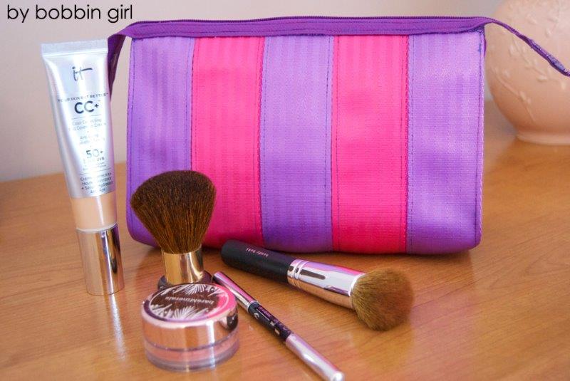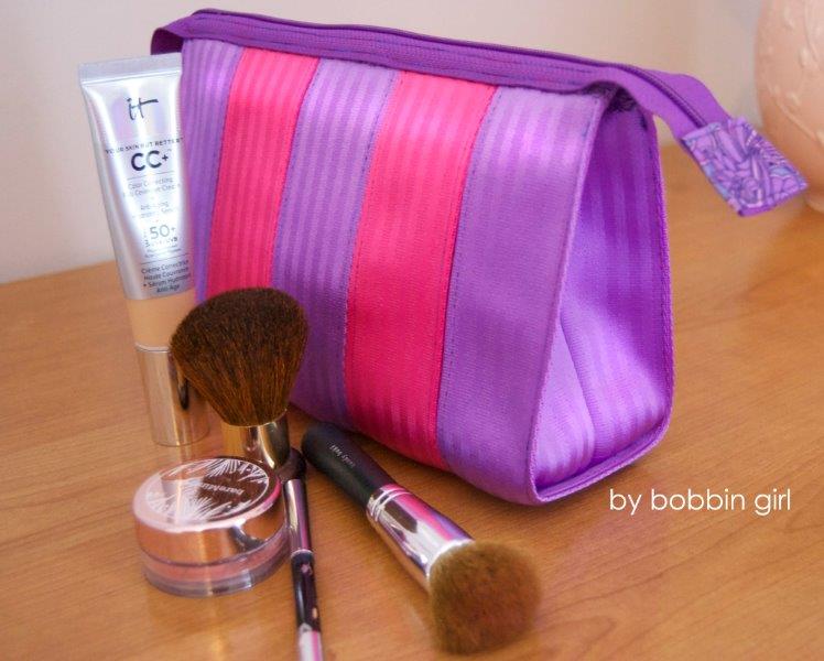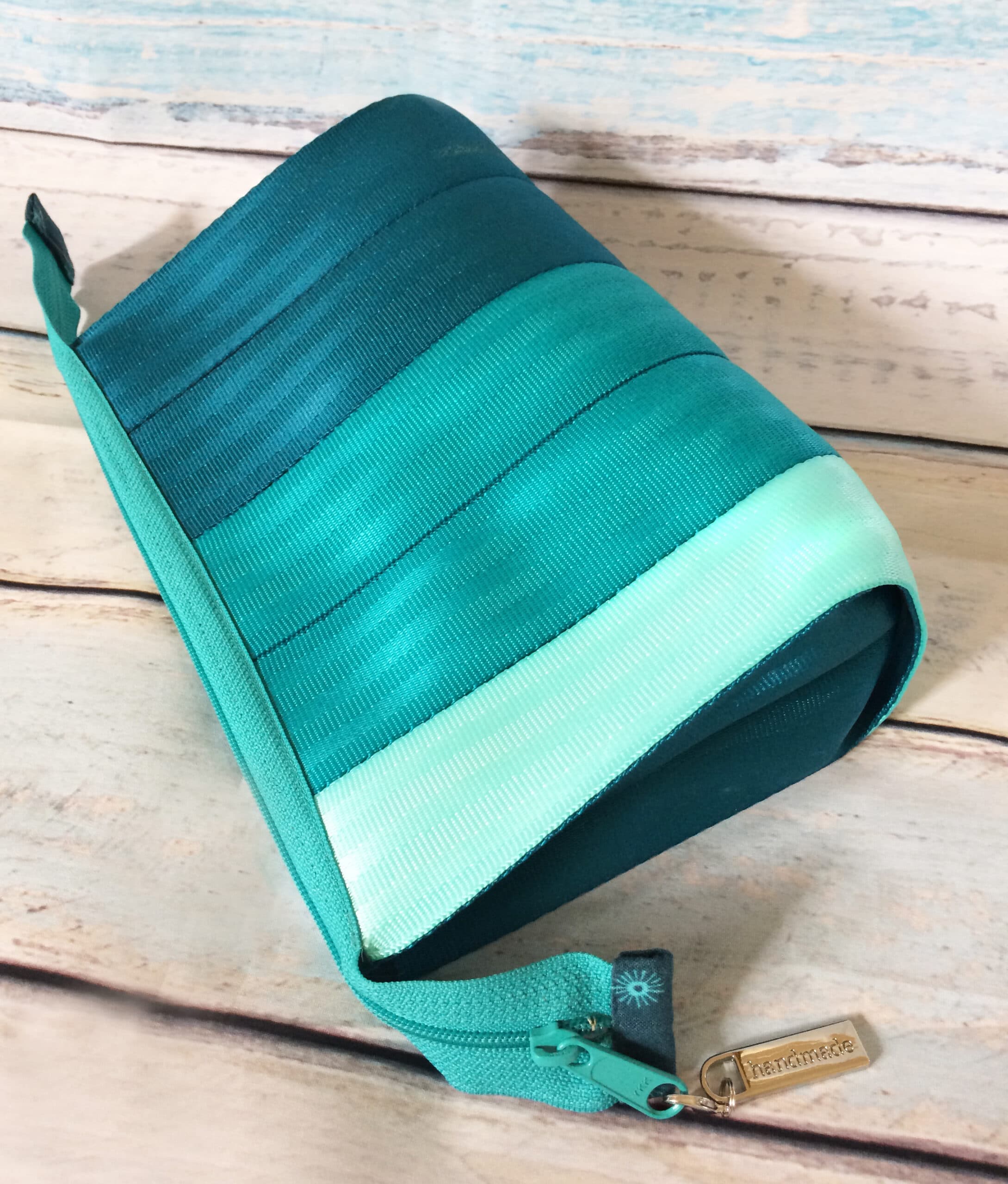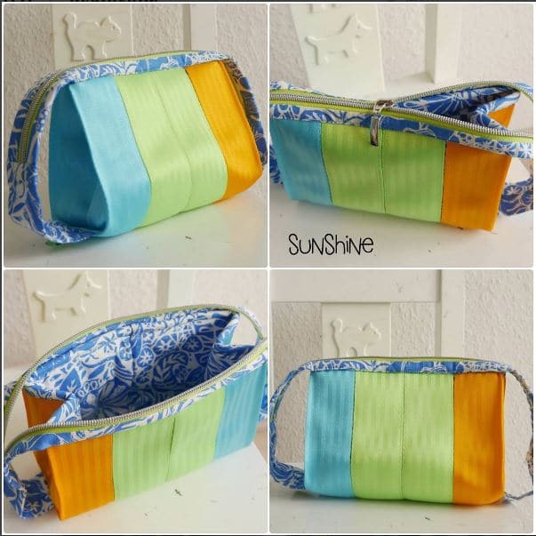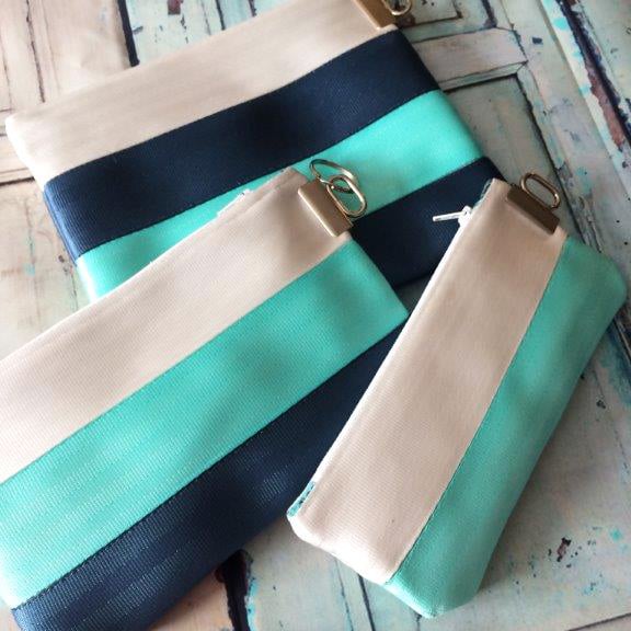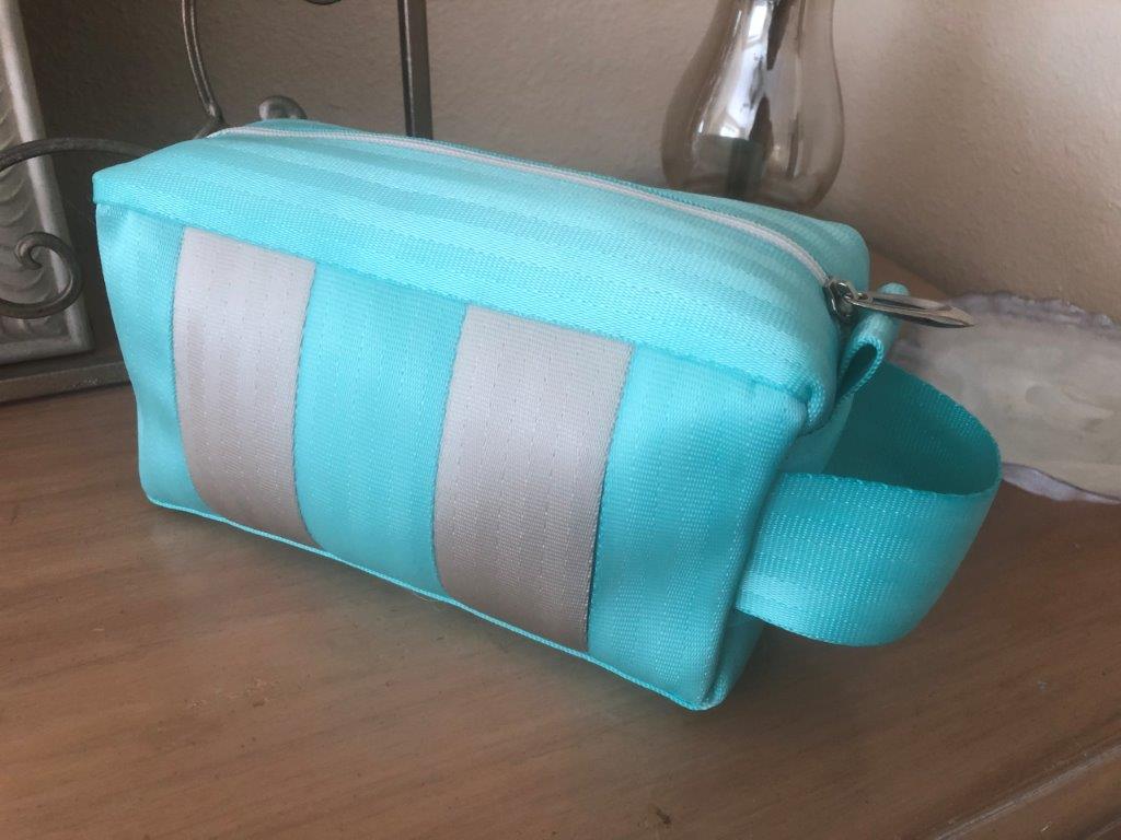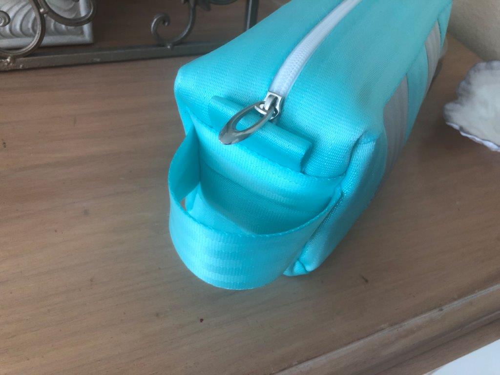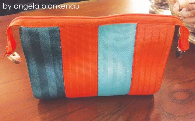- Angela’s cosmetic bag in aqua, orange and minty aqua