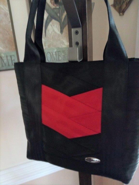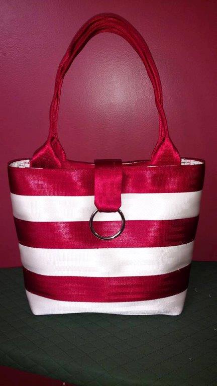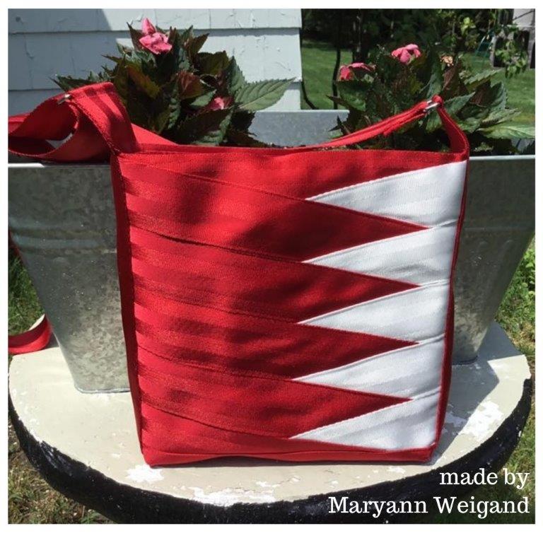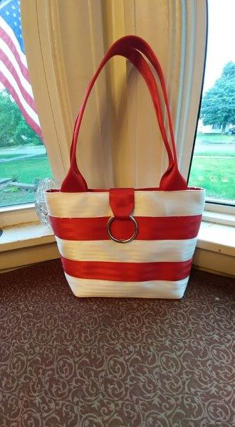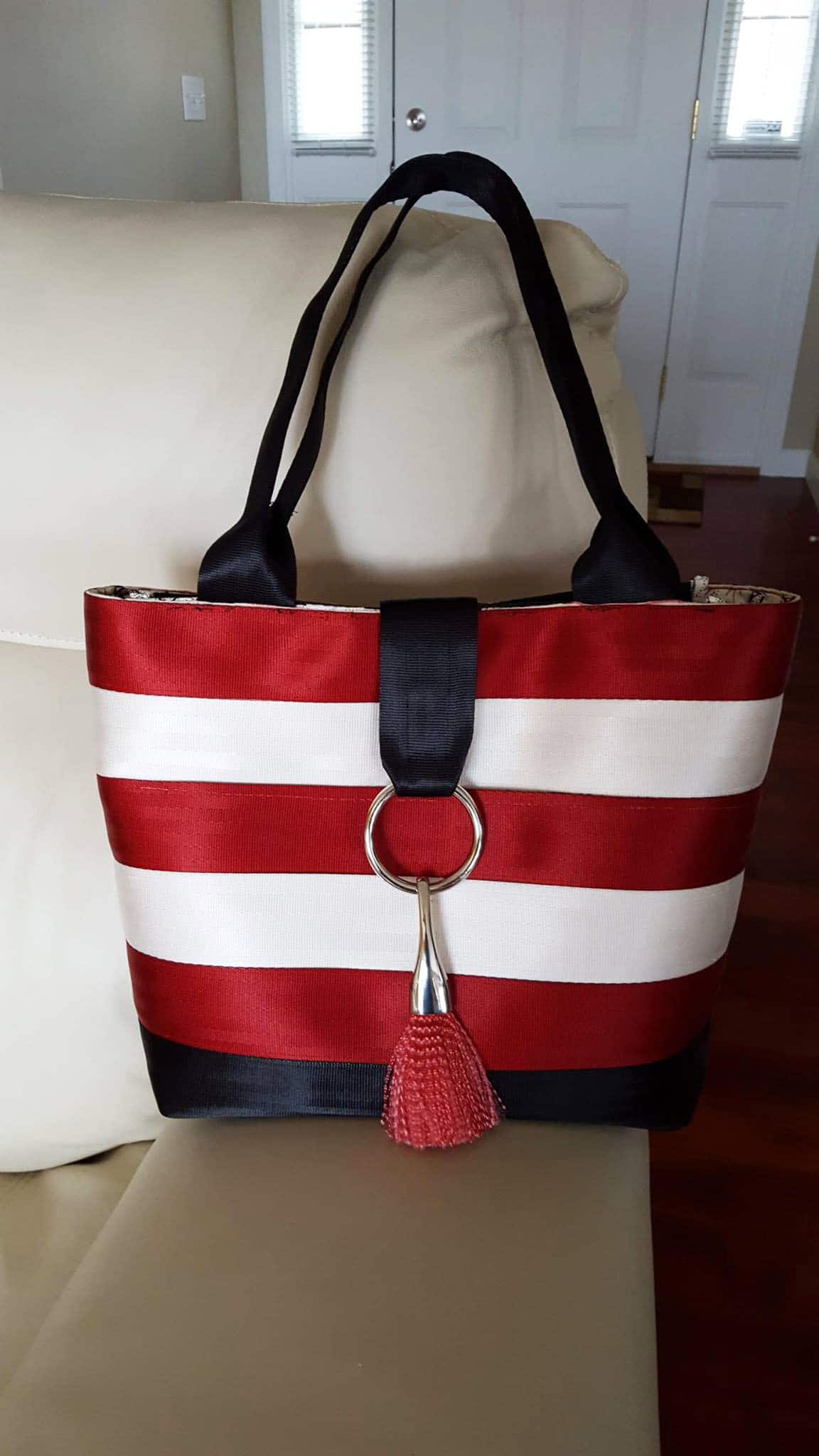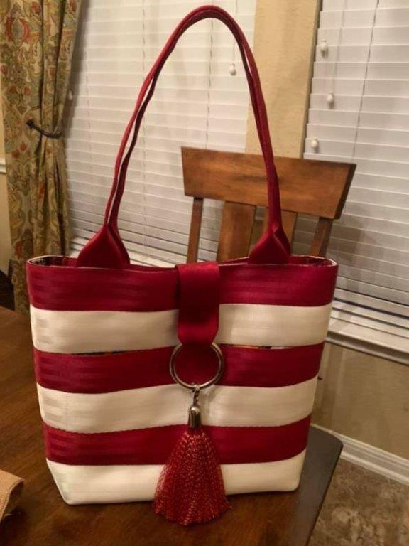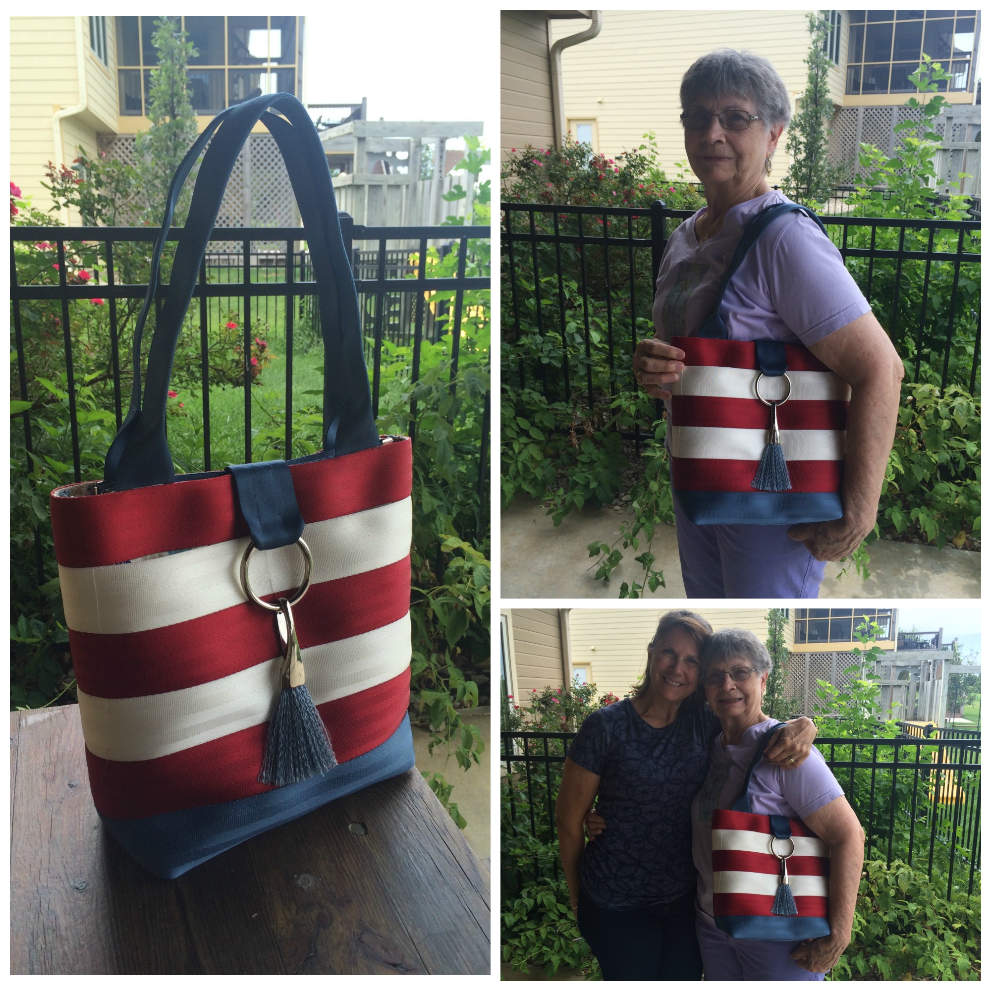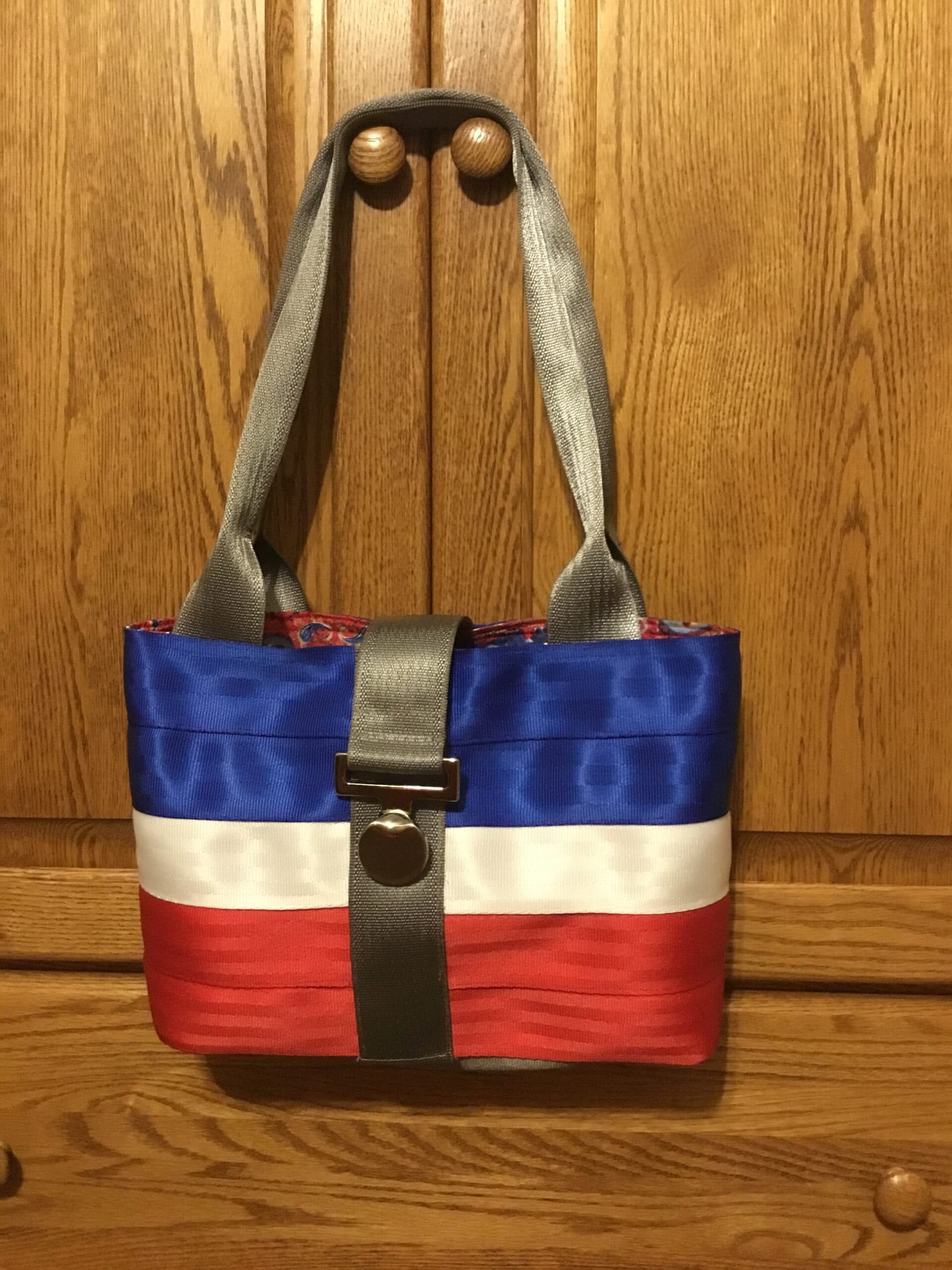 - Here’s Audrey and her very patriotic seat belt tote. Deep Red, snow & denim!
