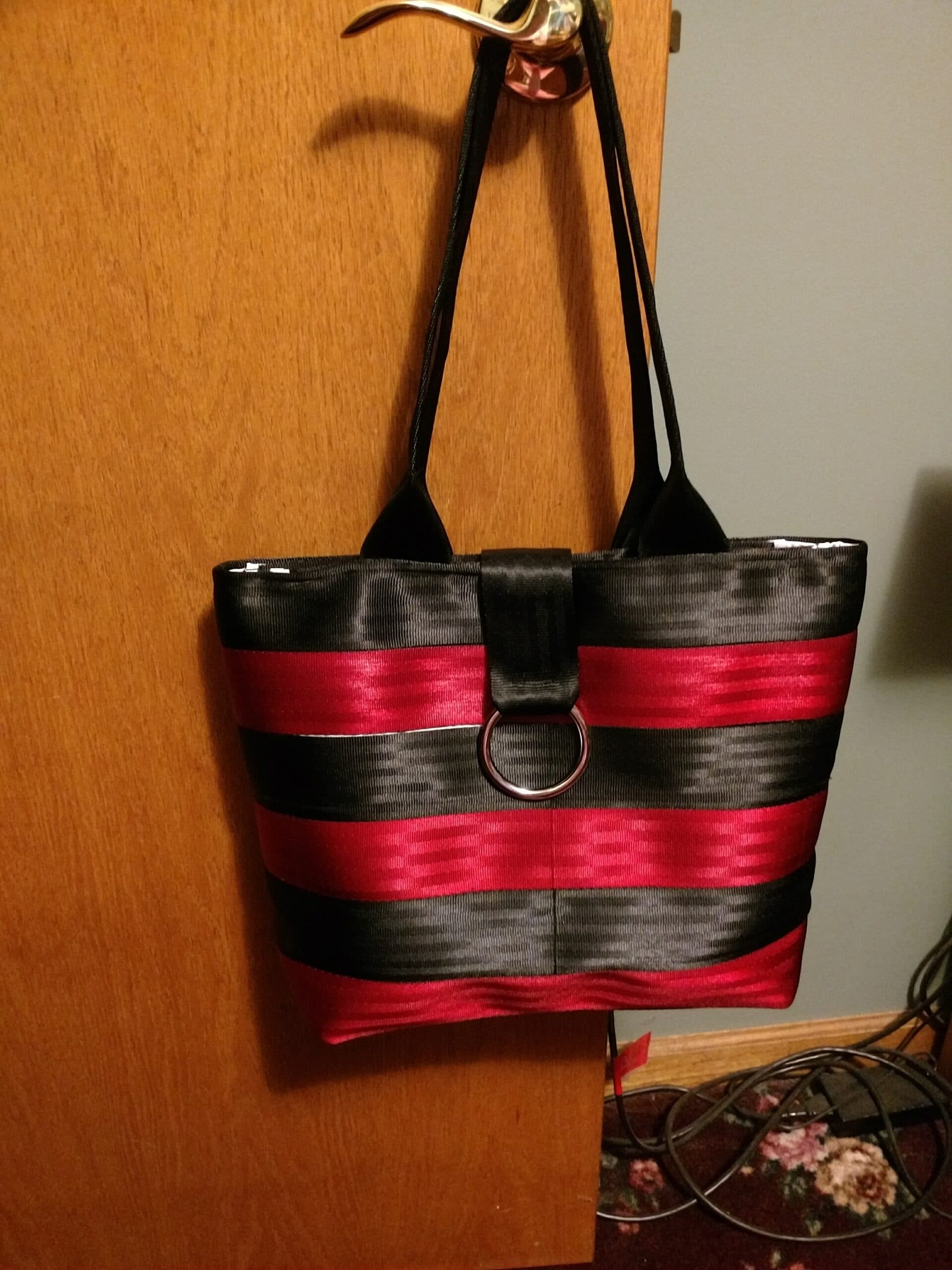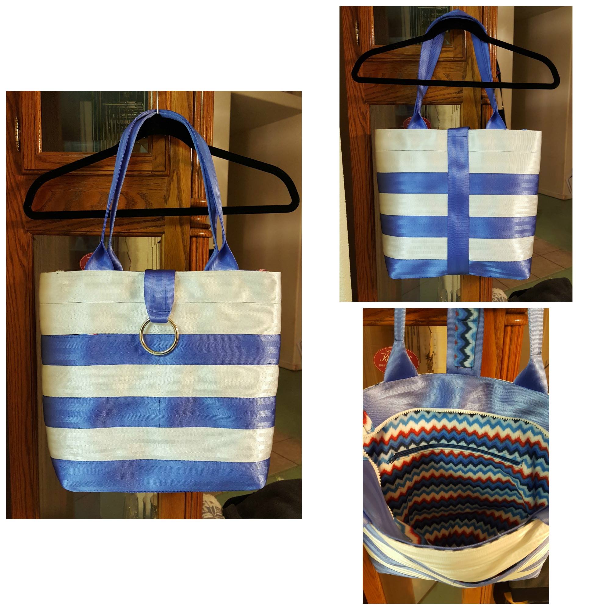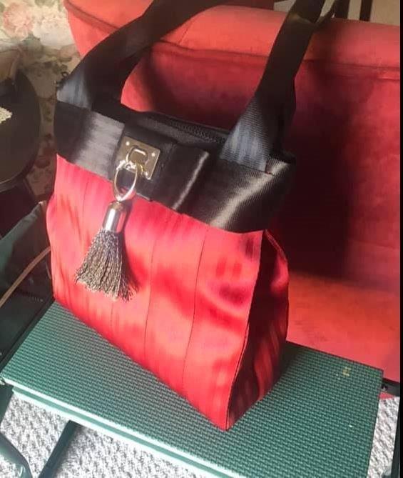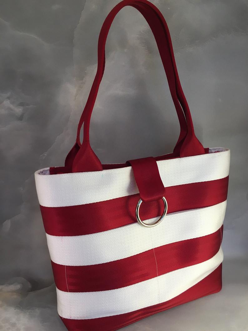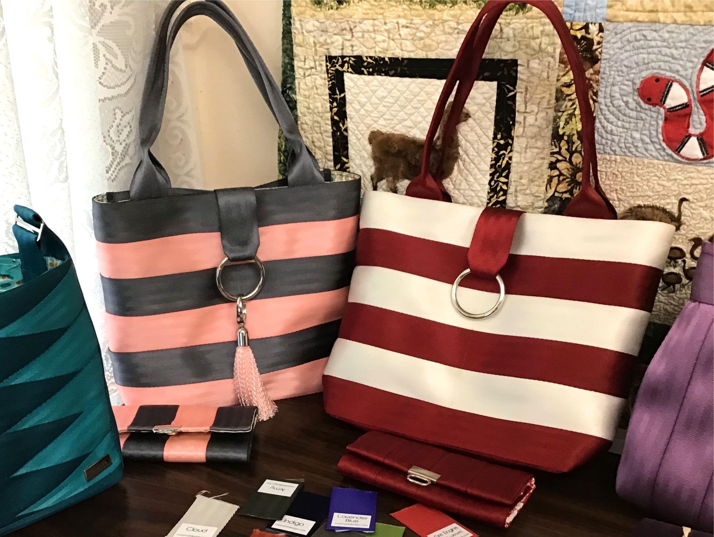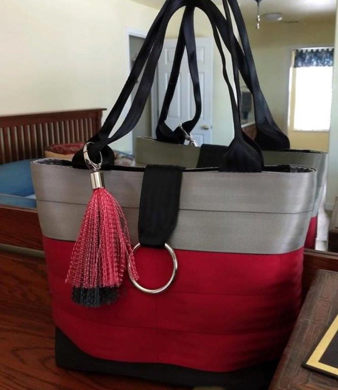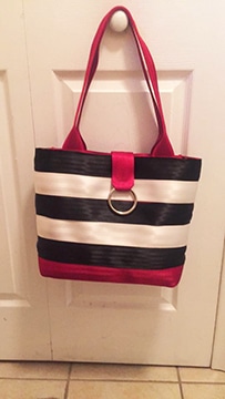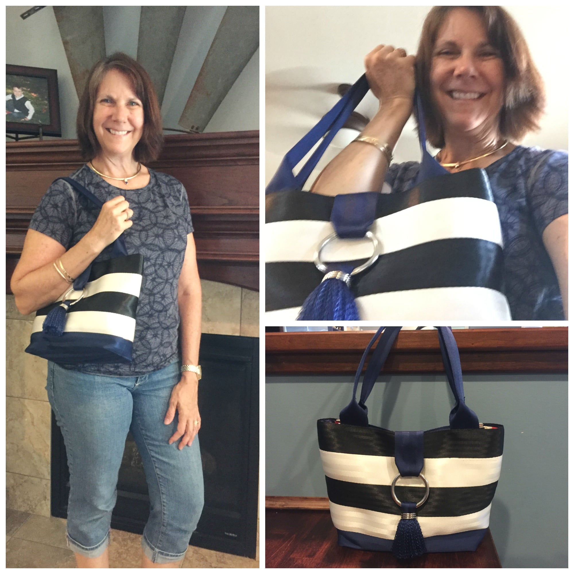 - Here’s Audrey and her very patriotic seat belt tote. Deep Red, snow & denim!
