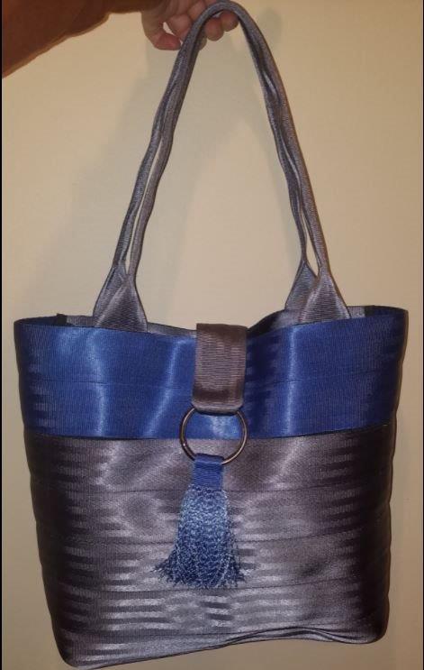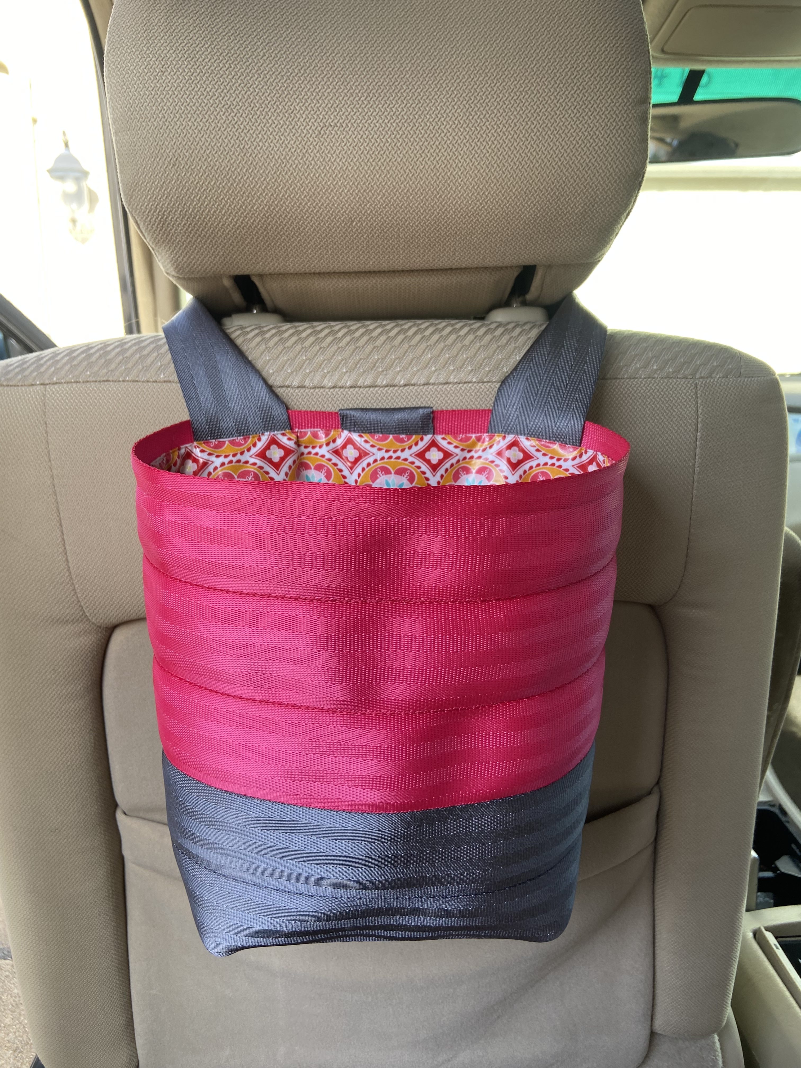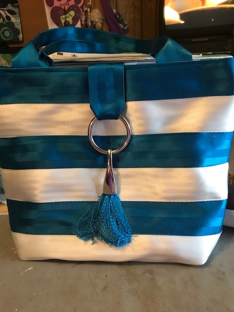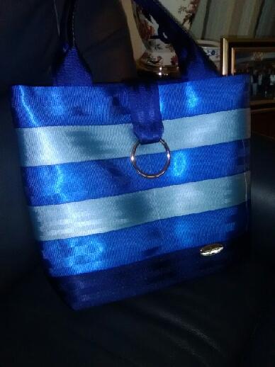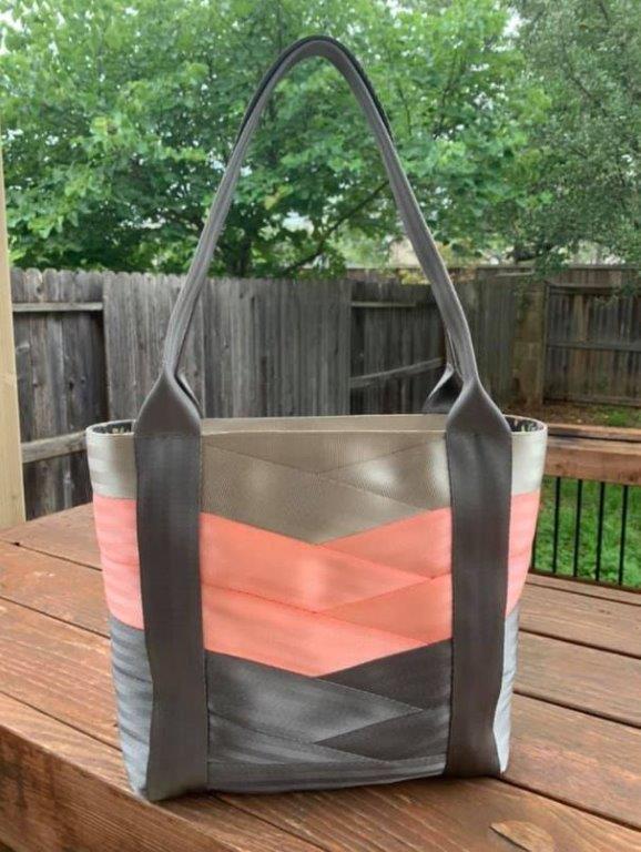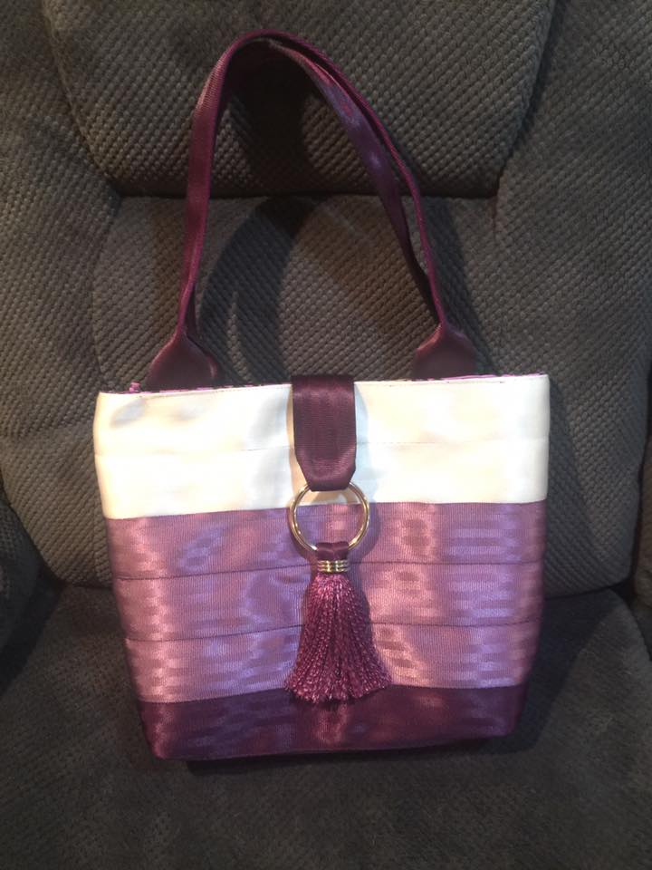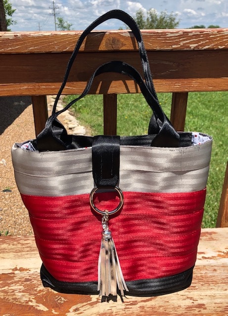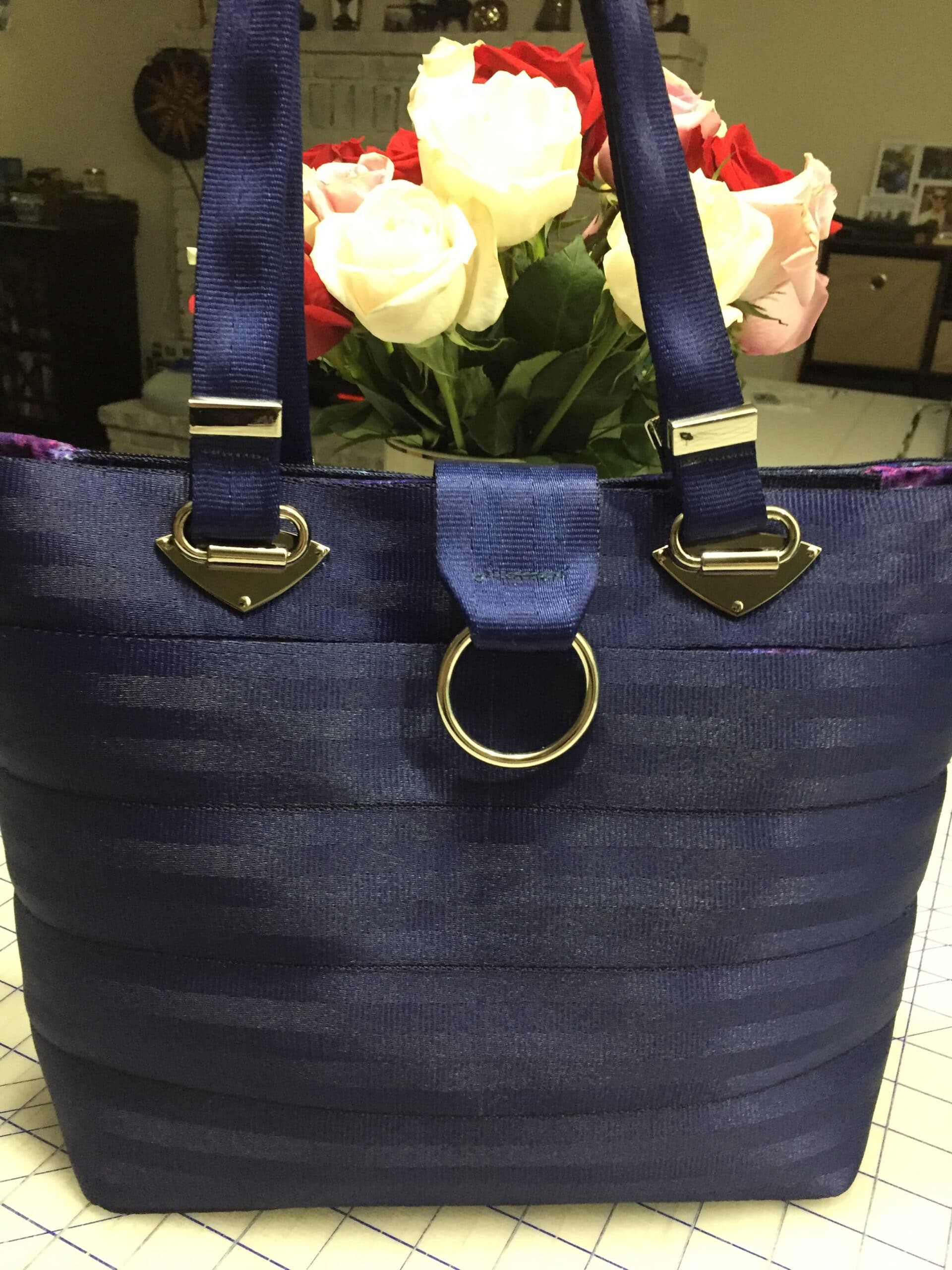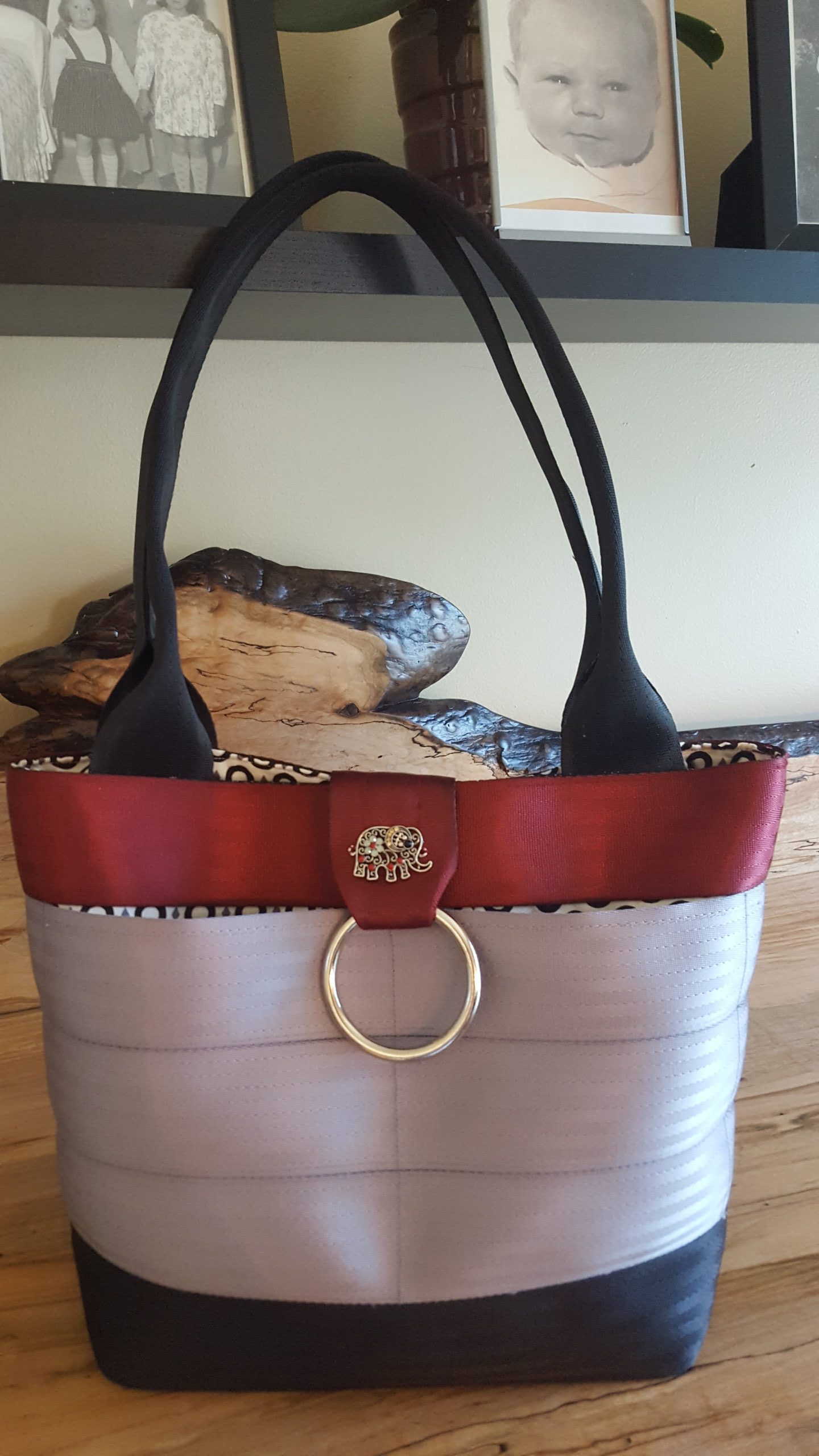- Here’s Audrey and her very patriotic seat belt tote. Deep Red, snow & denim!