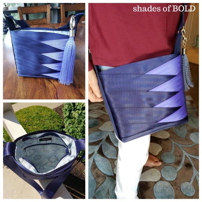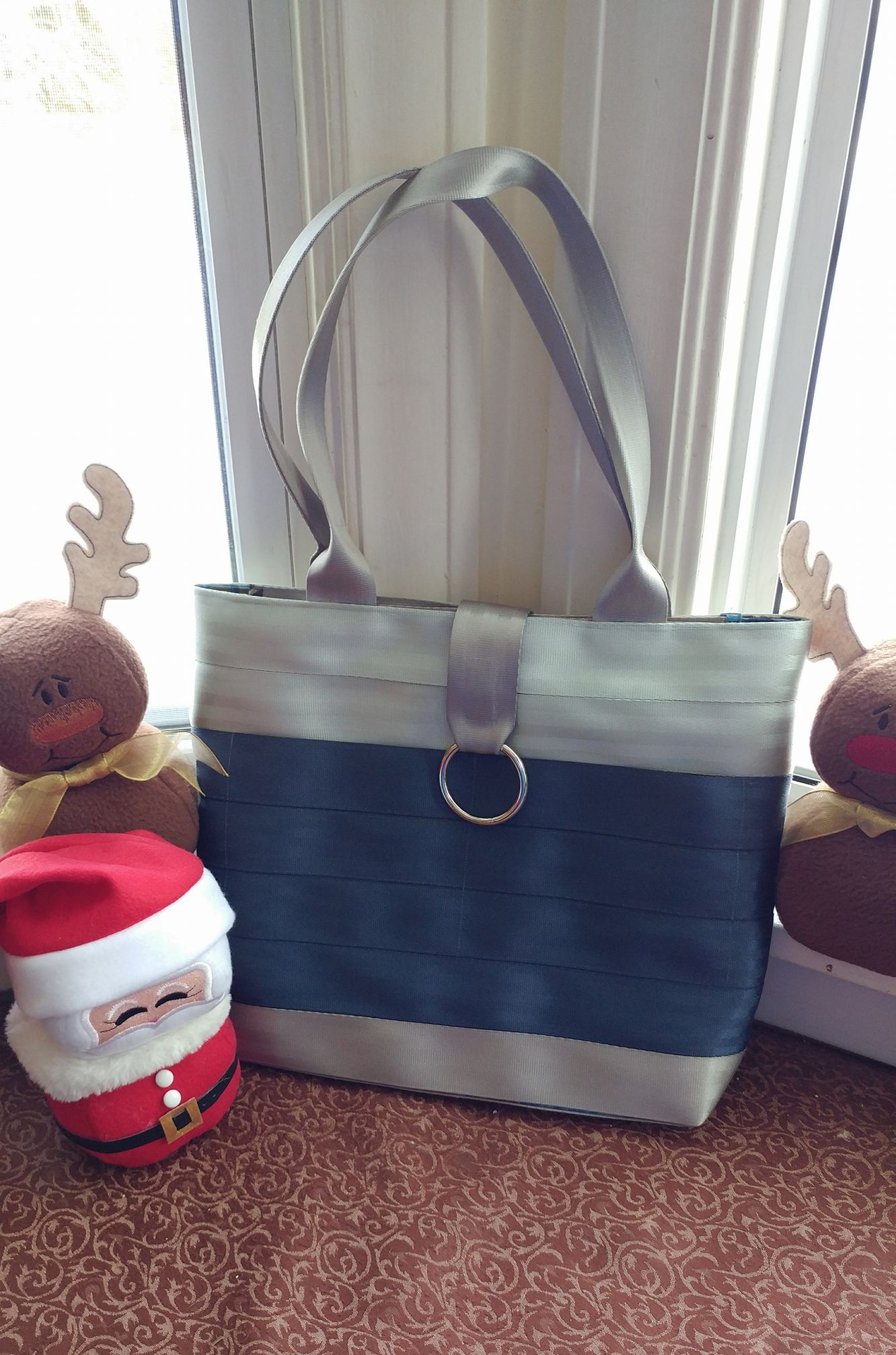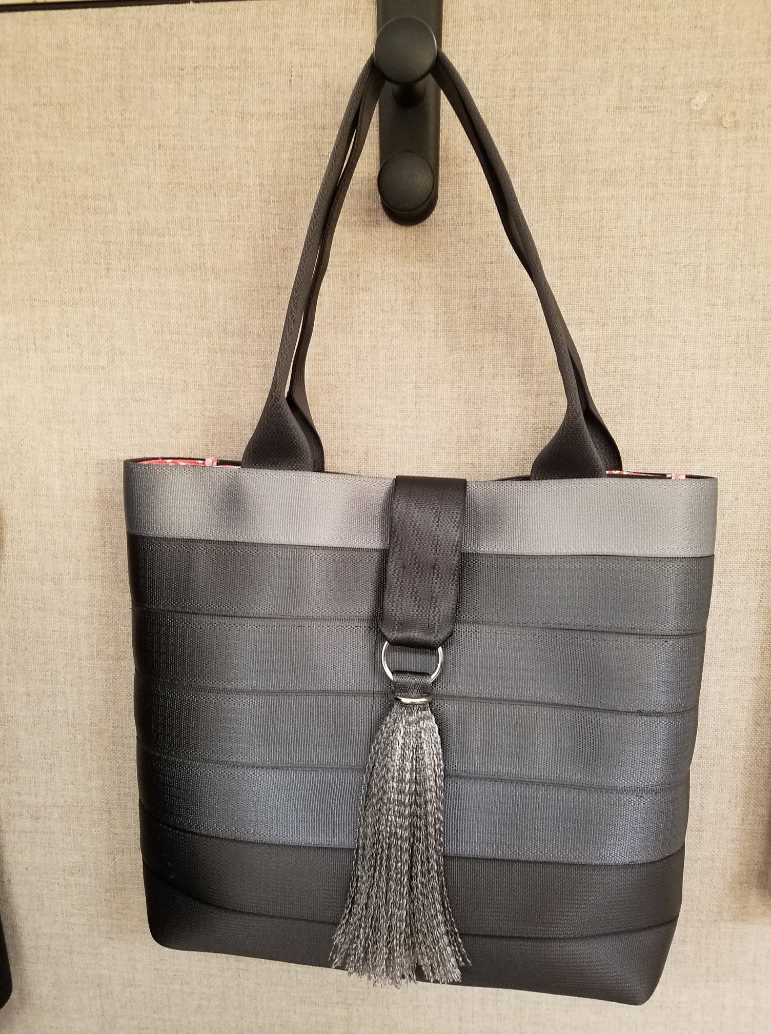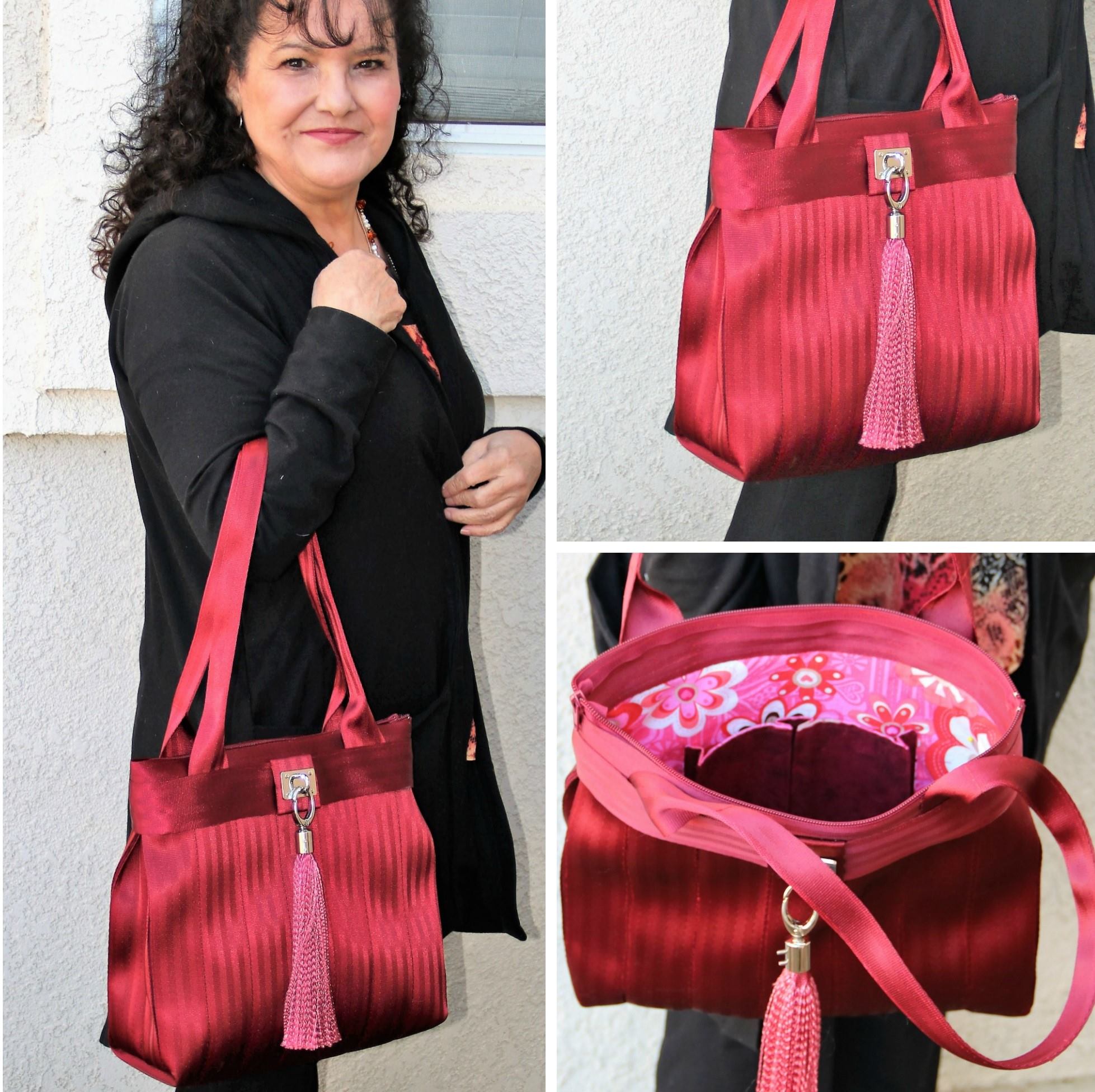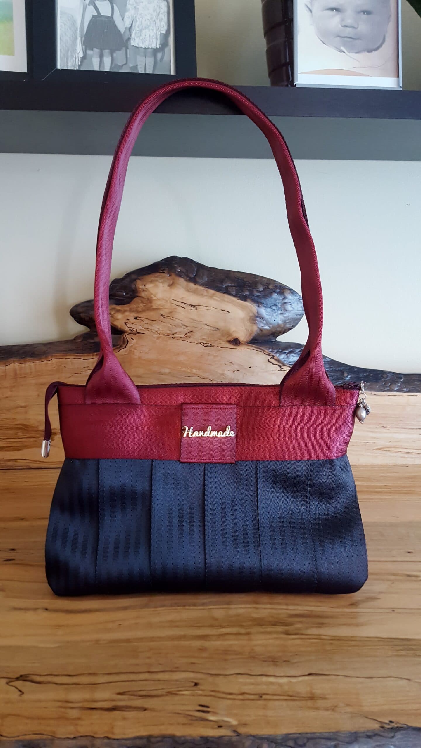 - Here’s Audrey and her very patriotic seat belt tote. Deep Red, snow & denim!