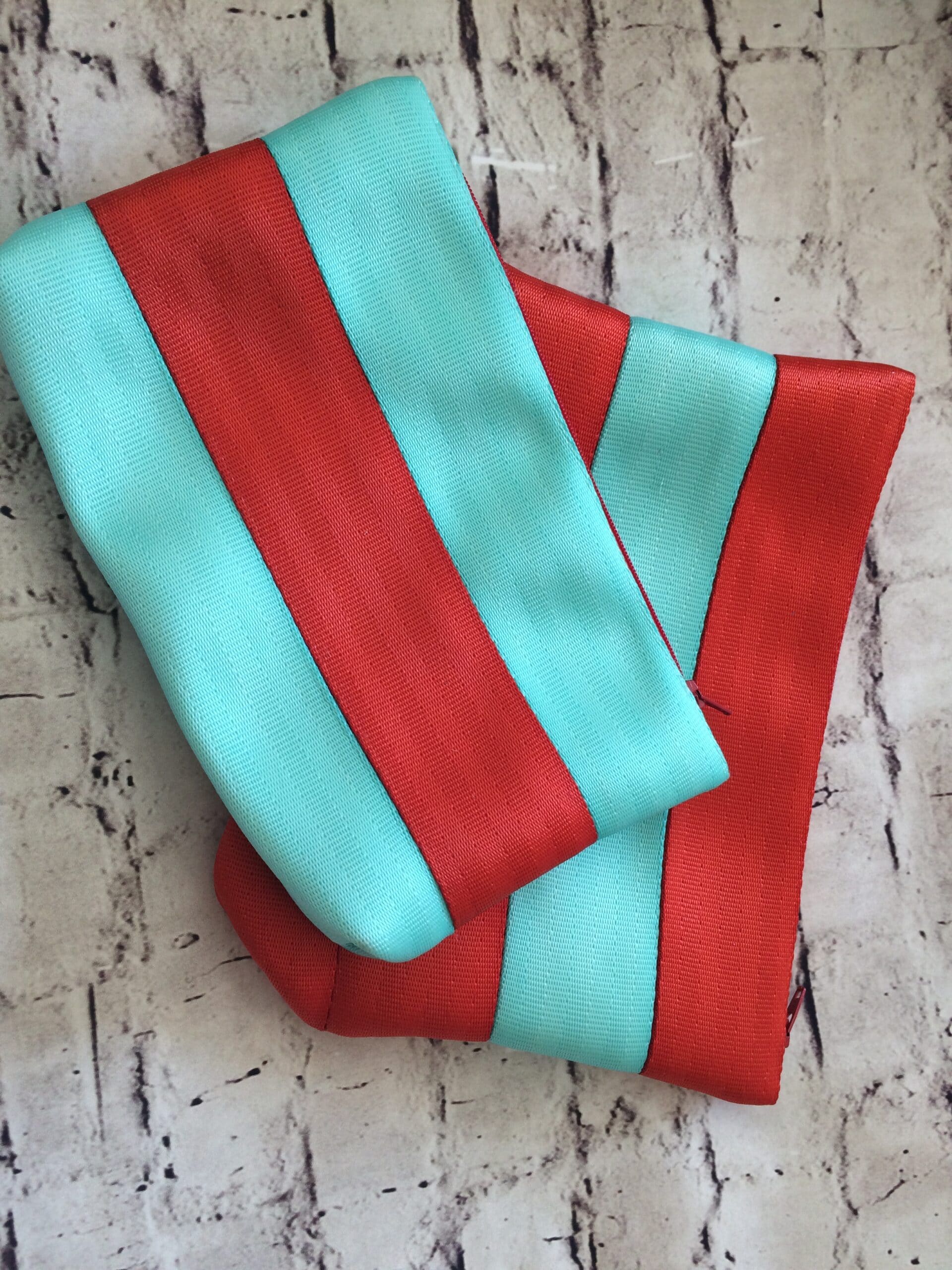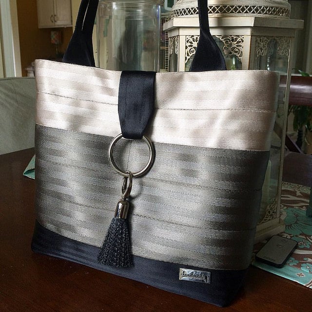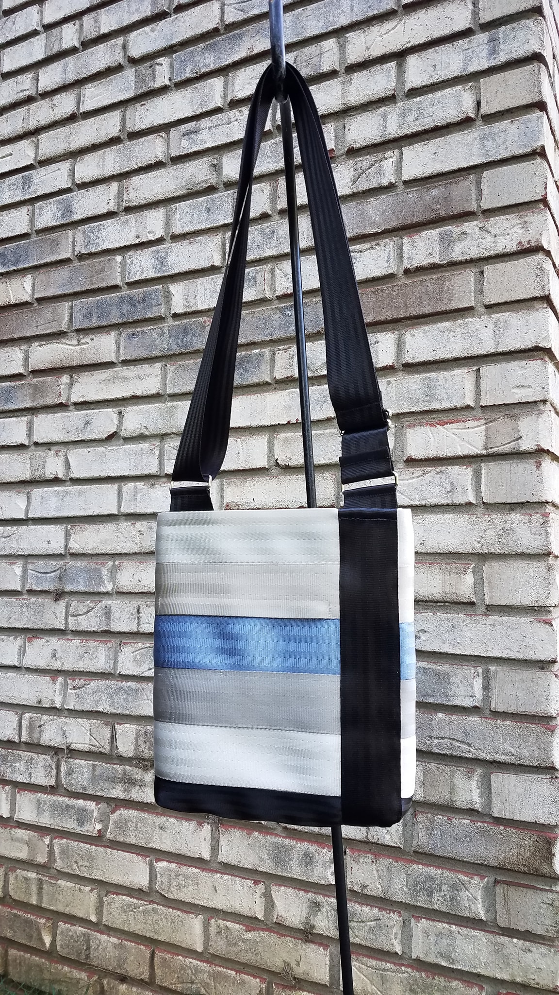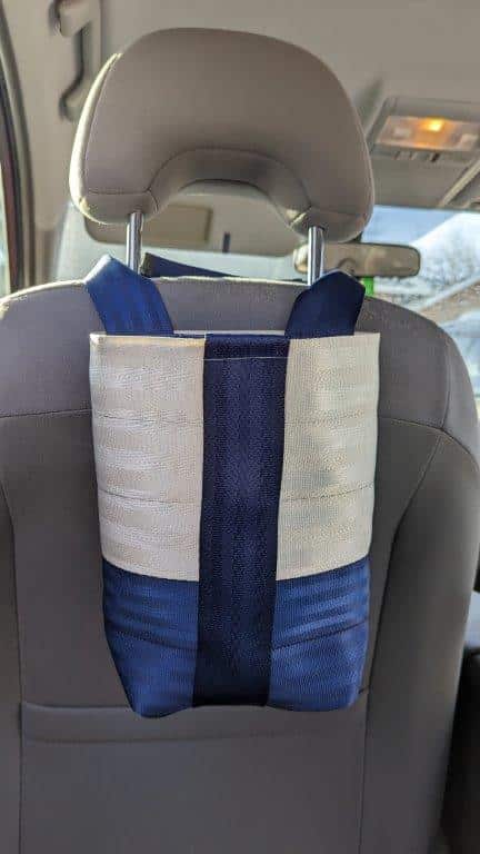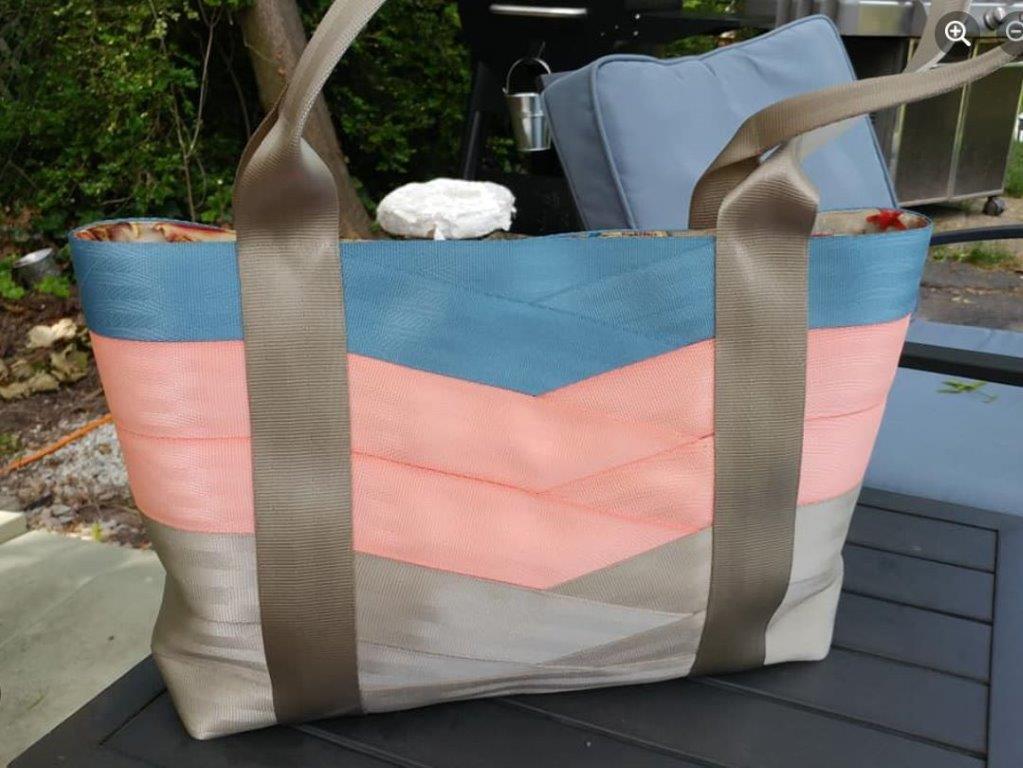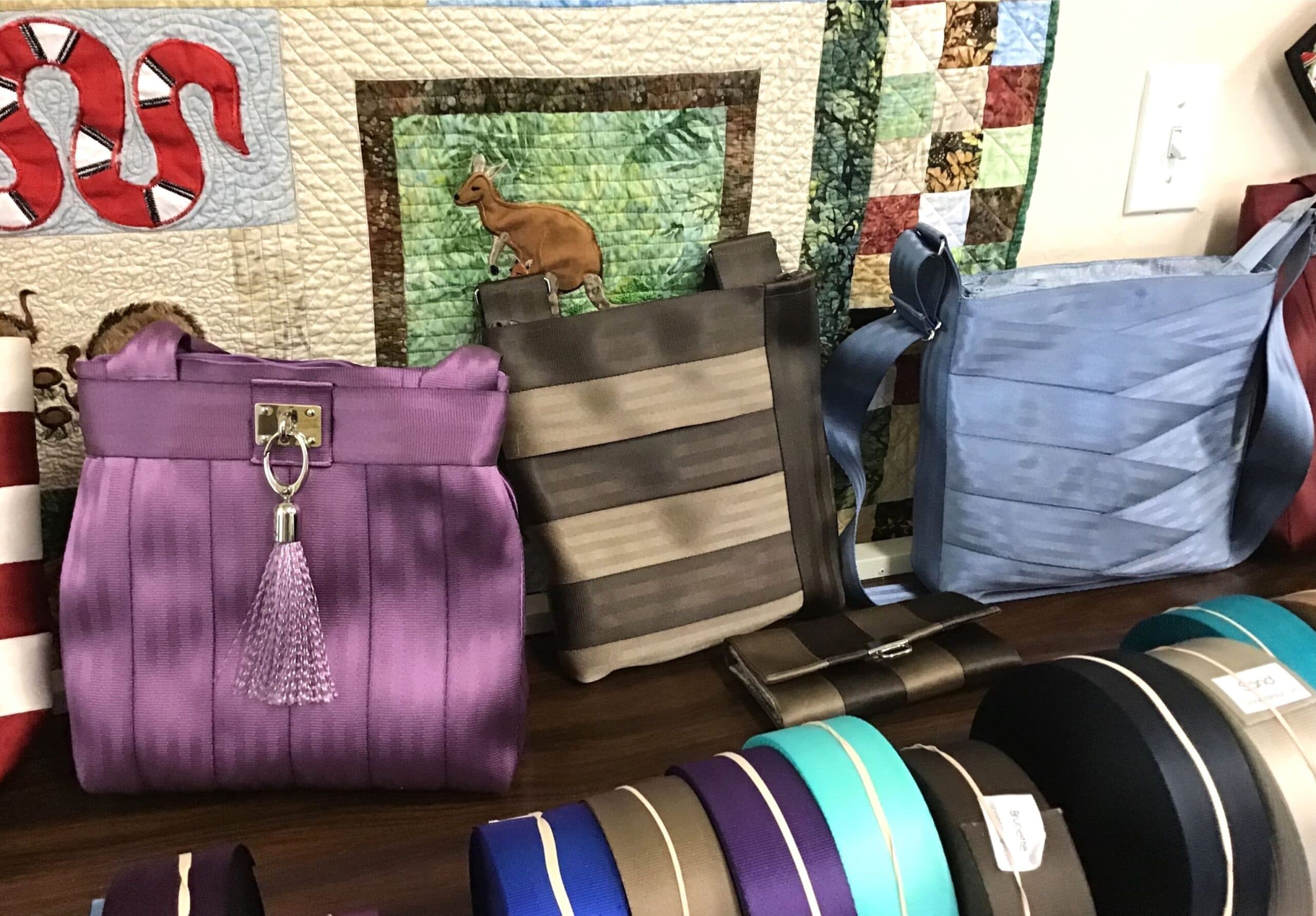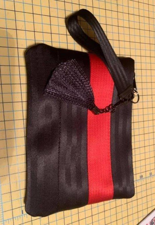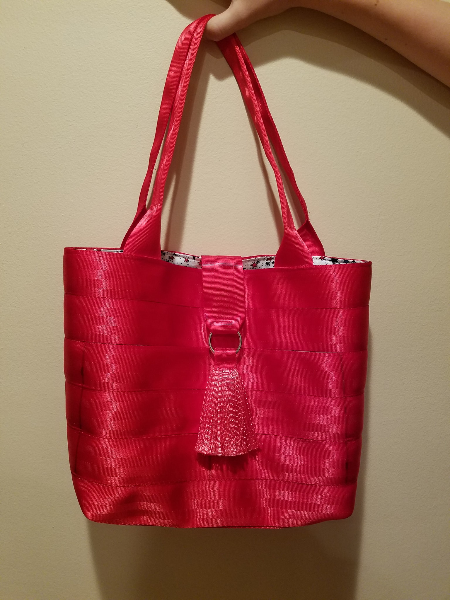 - Here’s Audrey and her very patriotic seat belt tote. Deep Red, snow & denim!