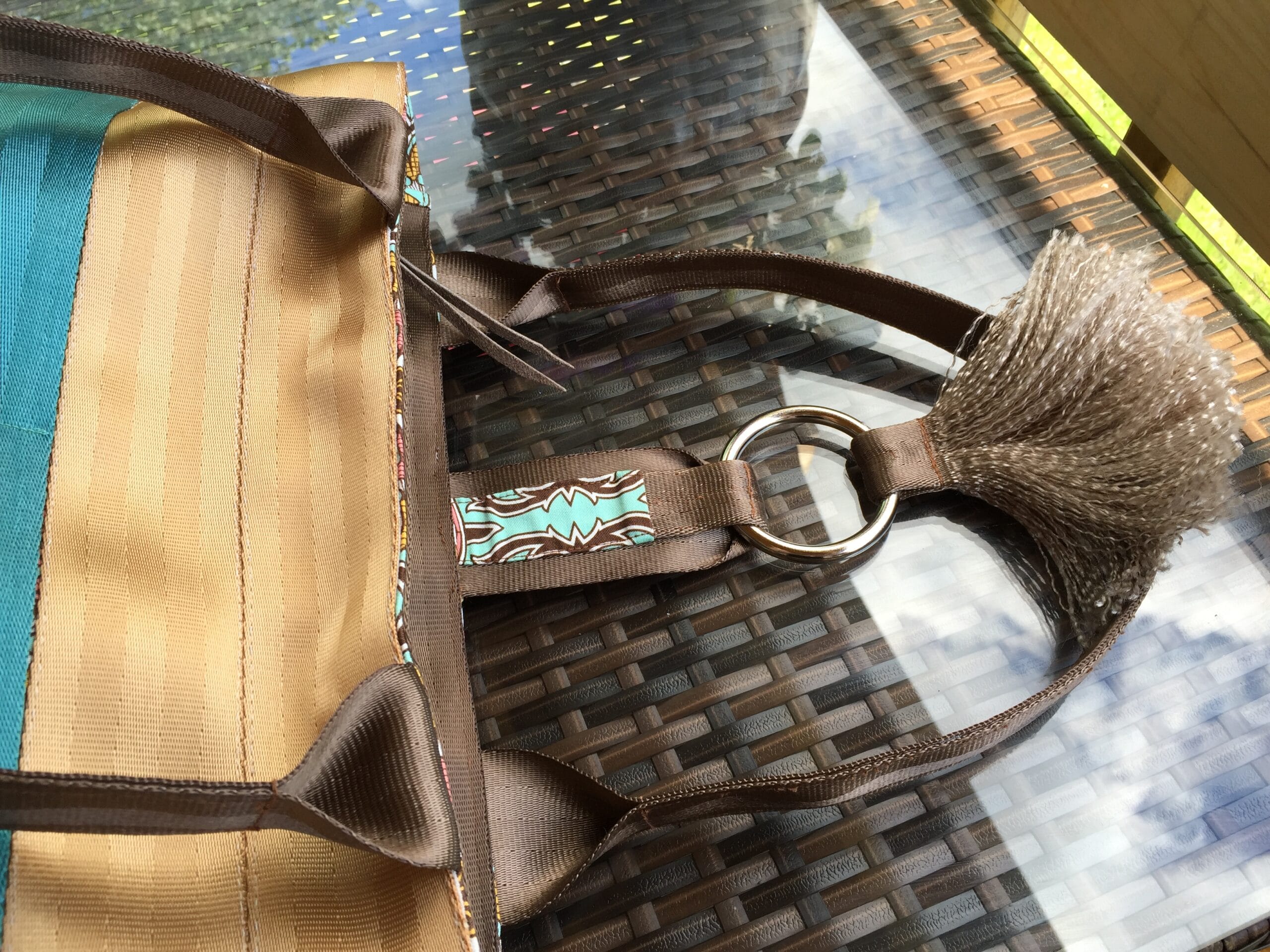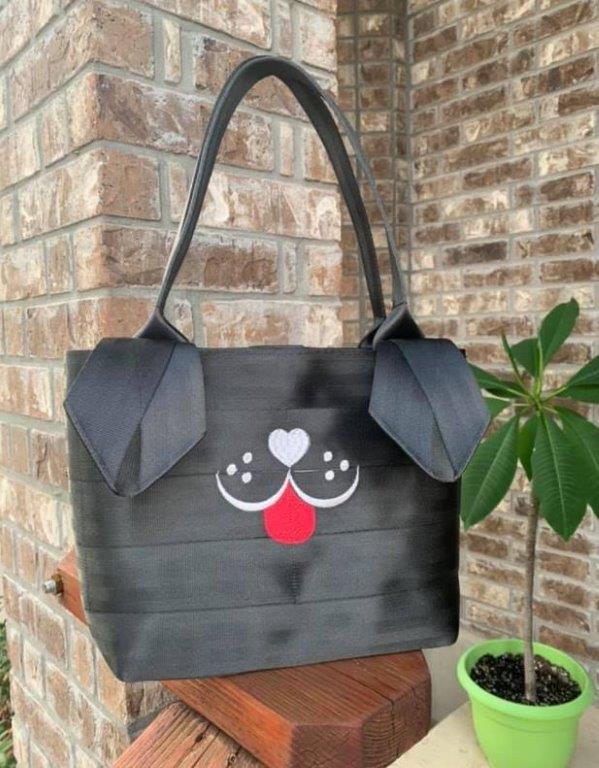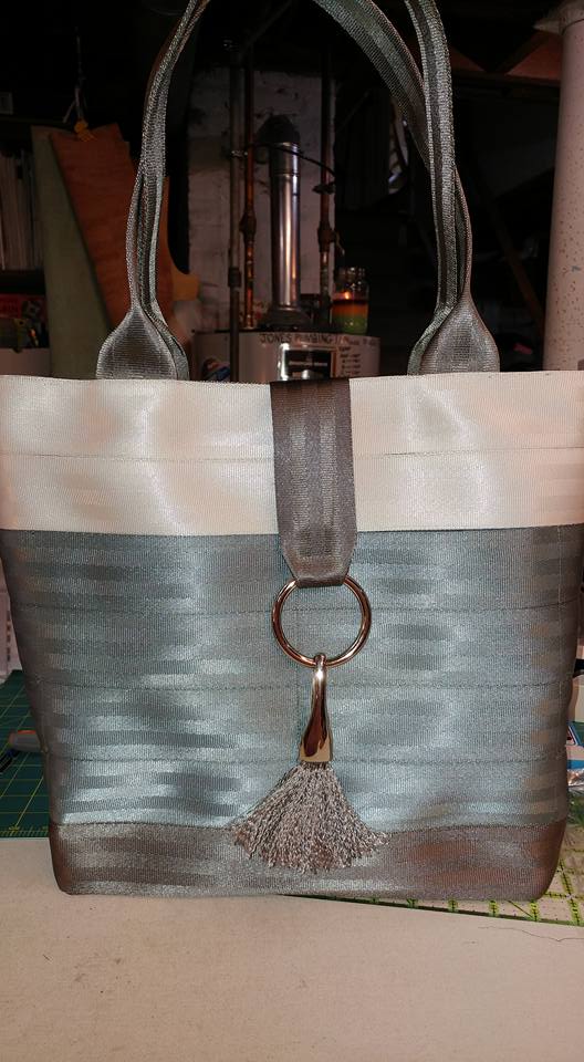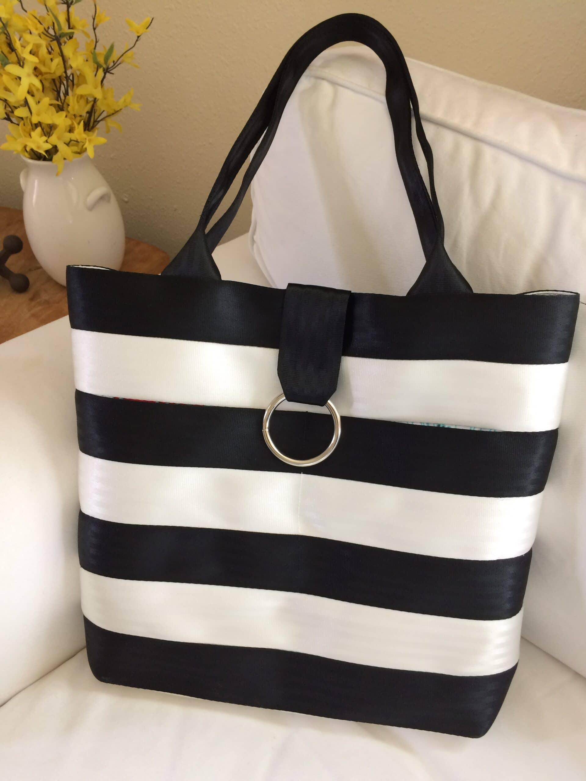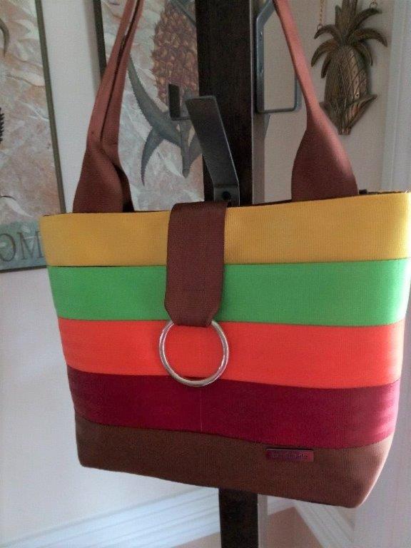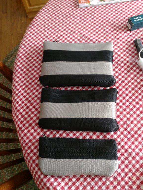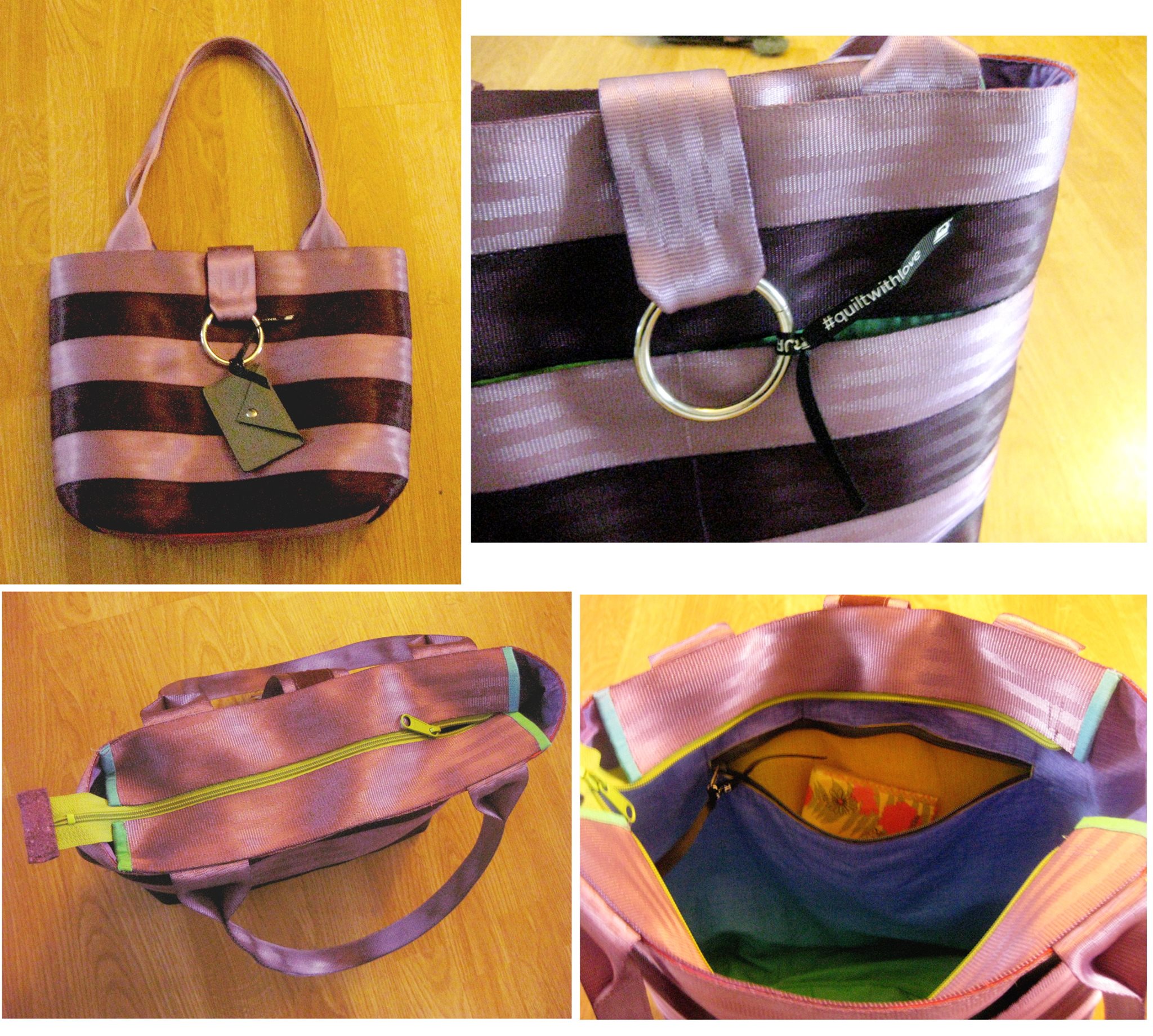 - Here’s Audrey and her very patriotic seat belt tote. Deep Red, snow & denim!