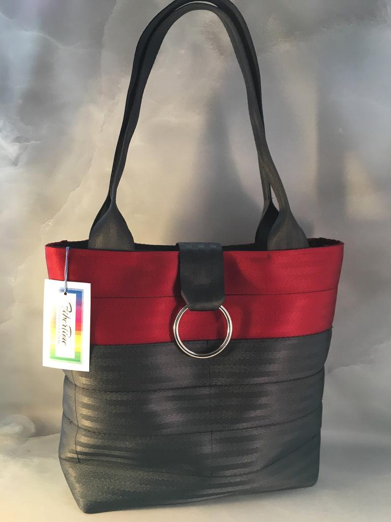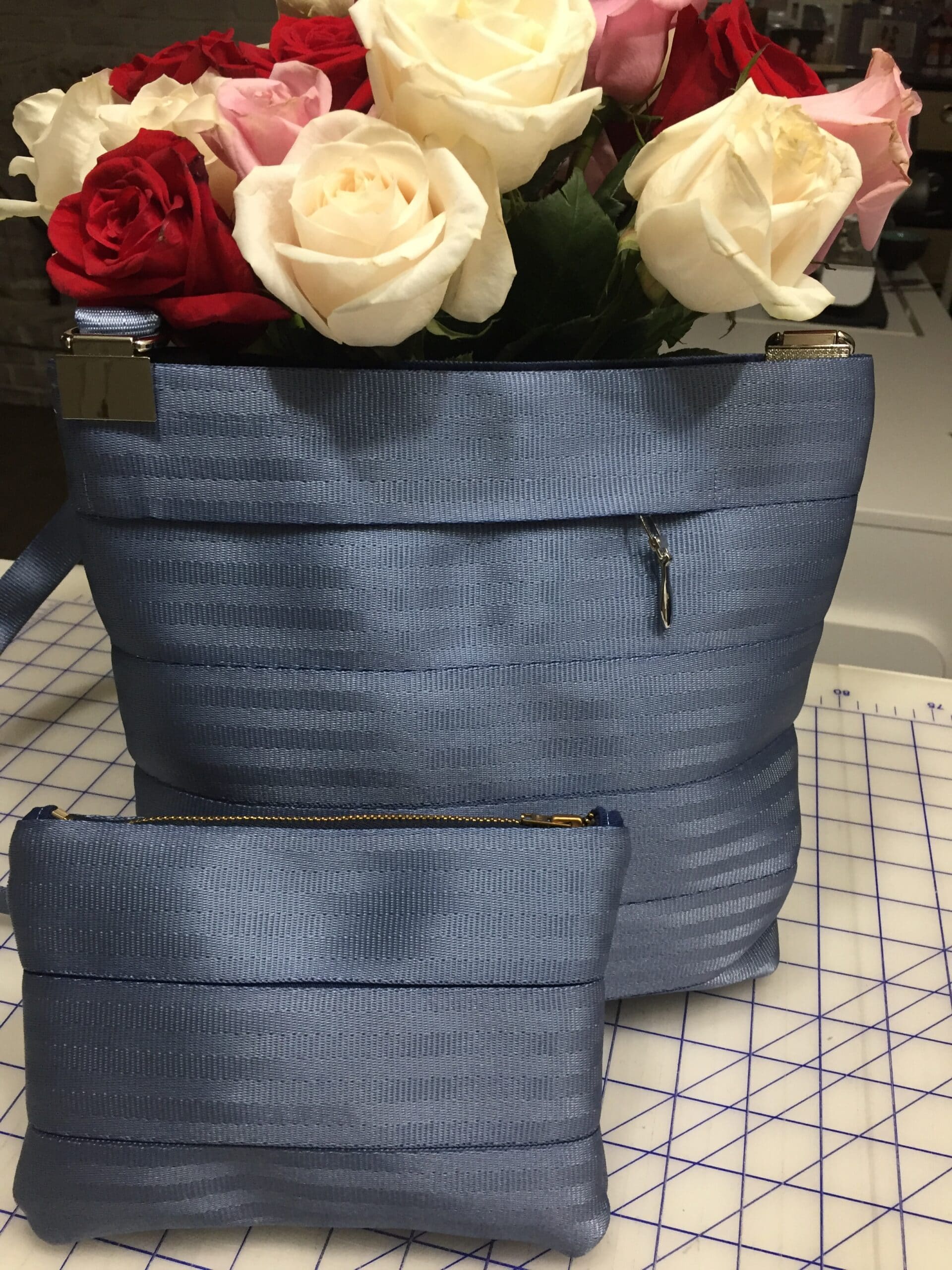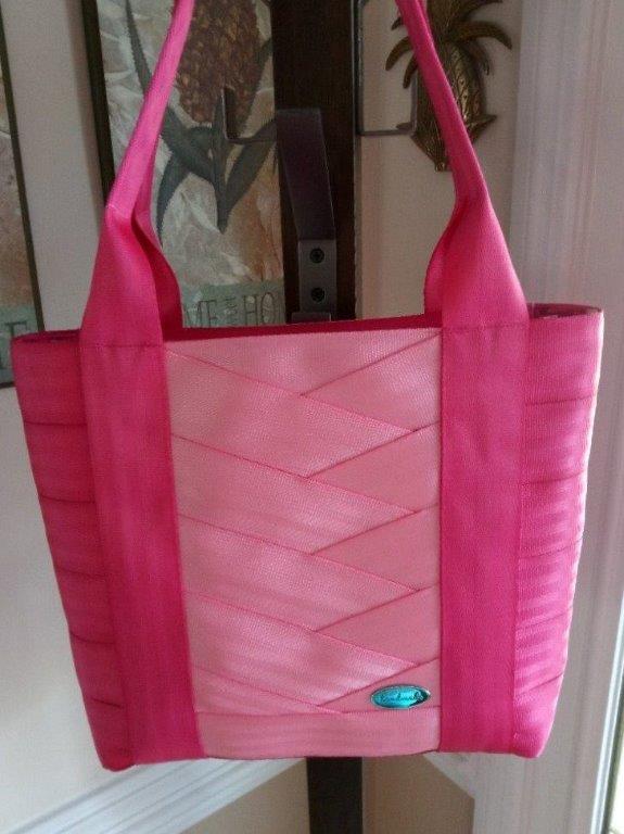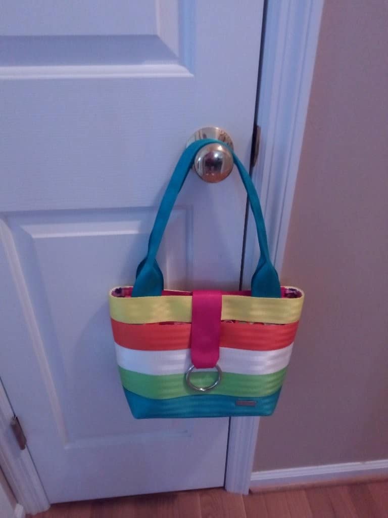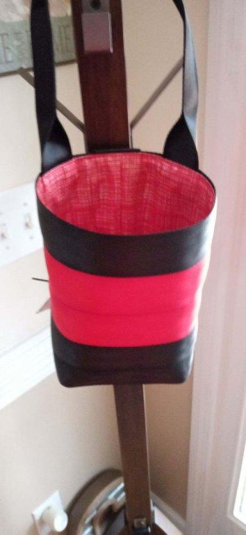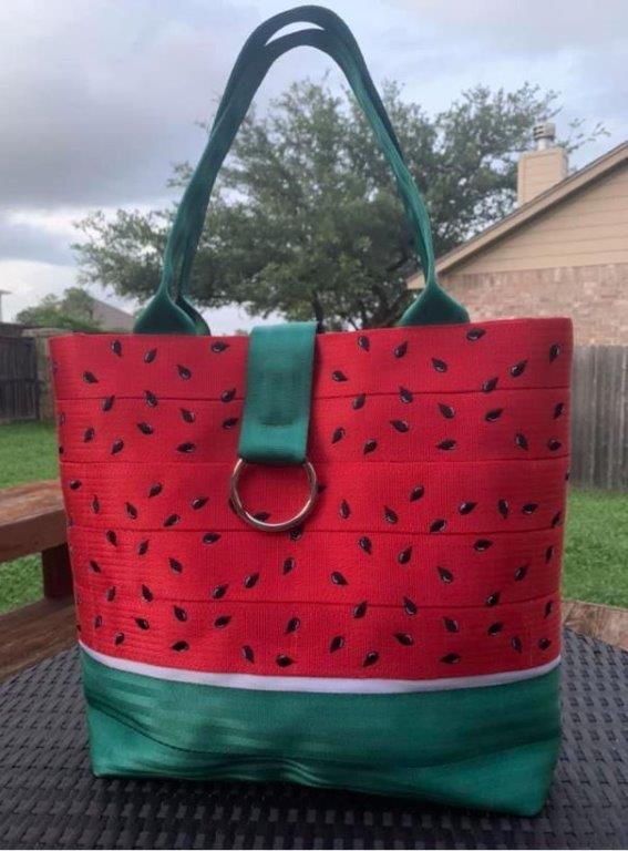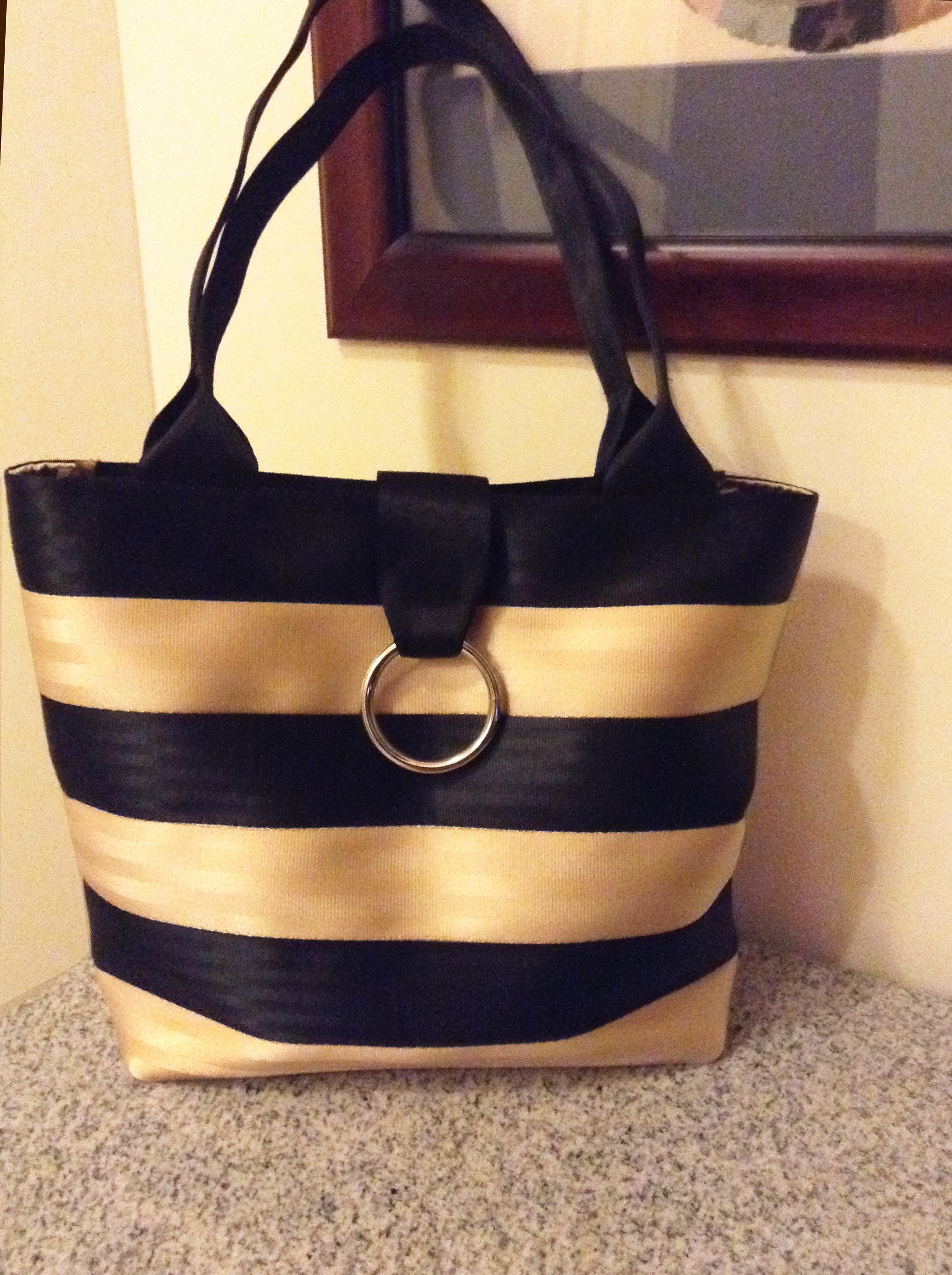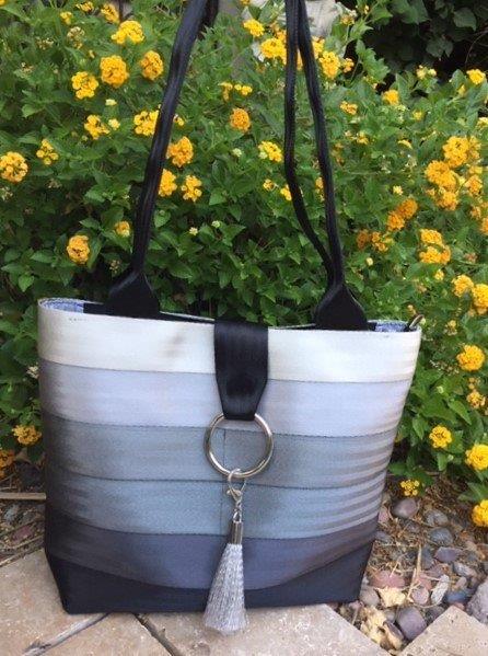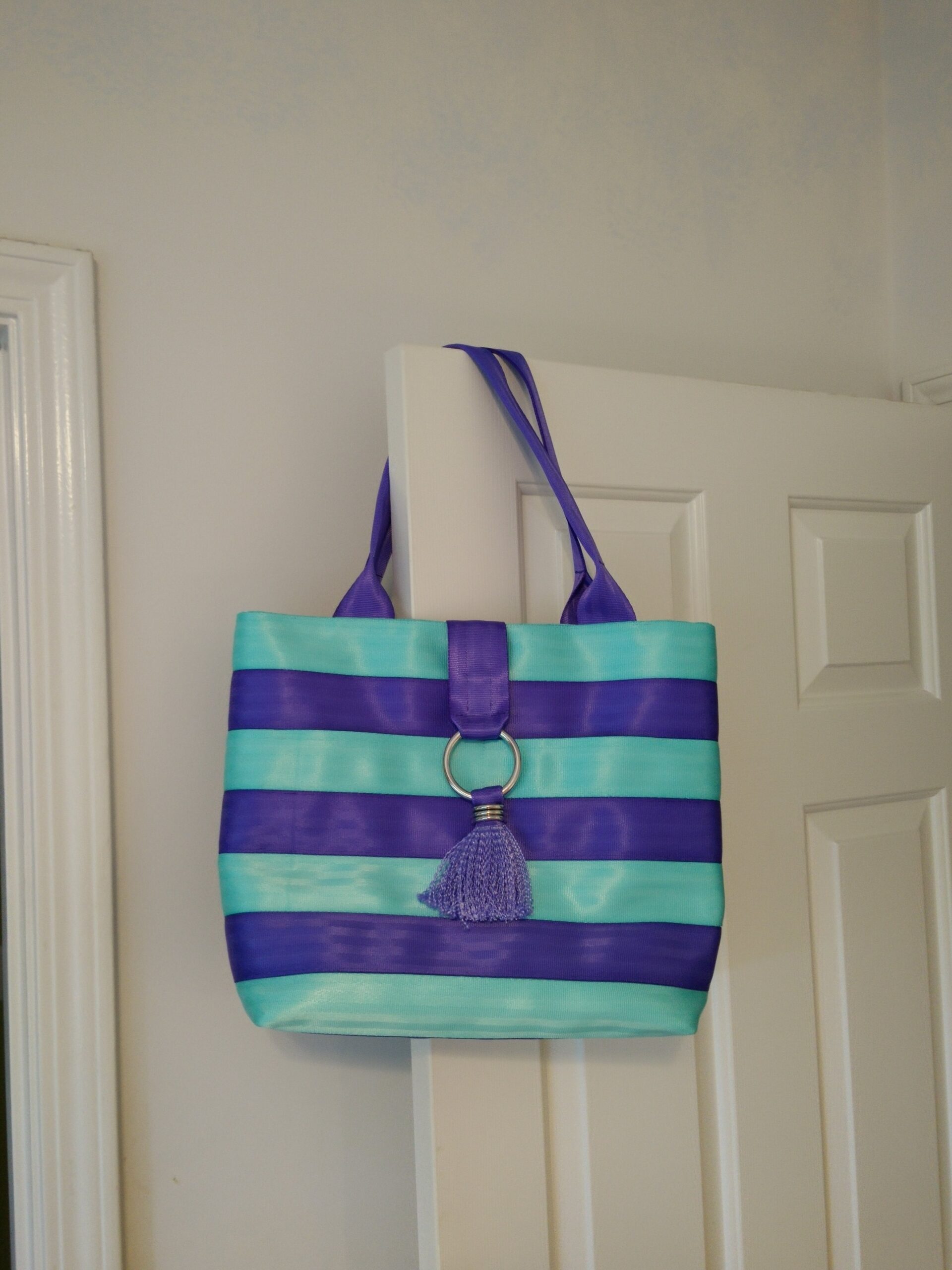 - Here’s Audrey and her very patriotic seat belt tote. Deep Red, snow & denim!