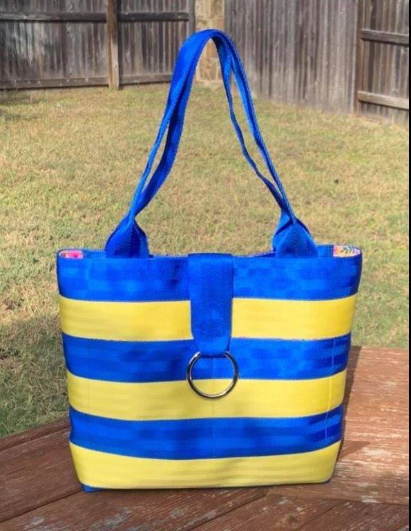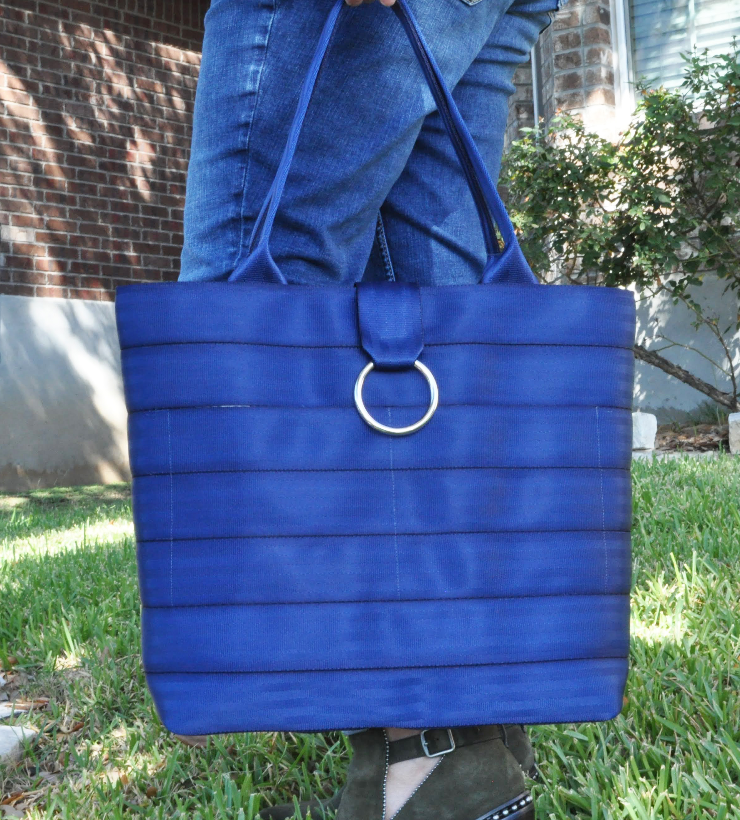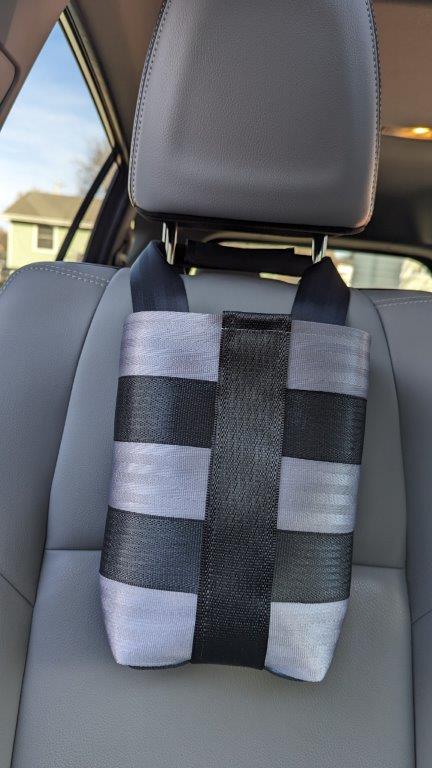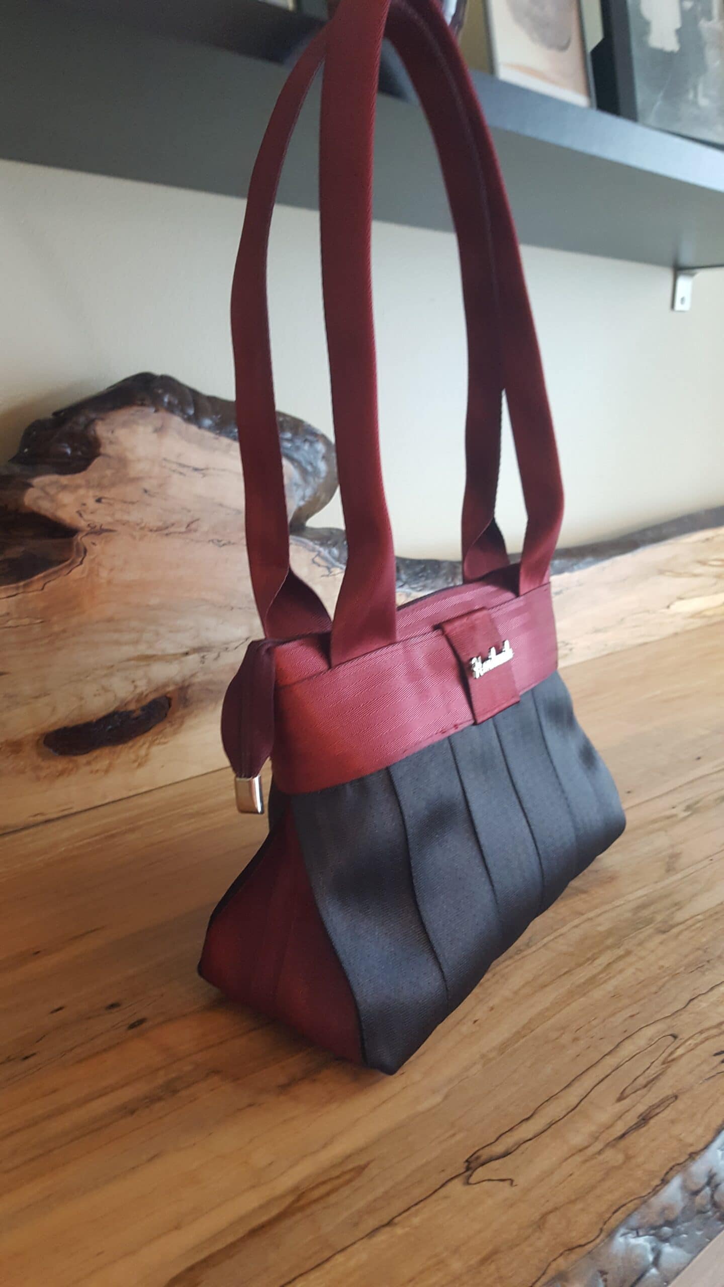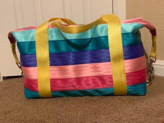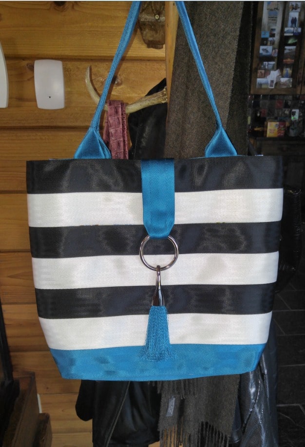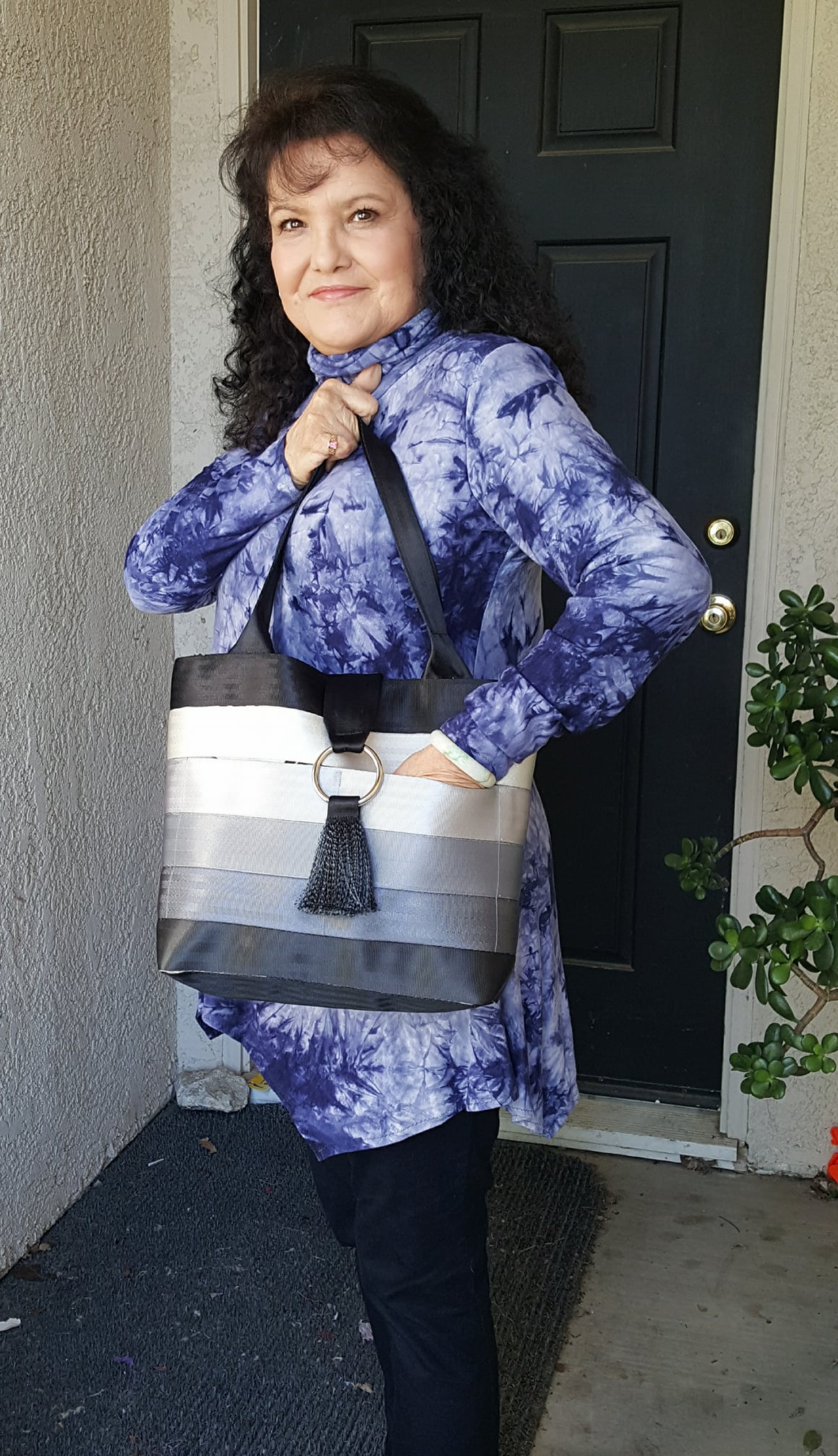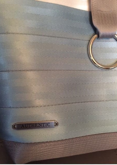 - Here’s Audrey and her very patriotic seat belt tote. Deep Red, snow & denim!