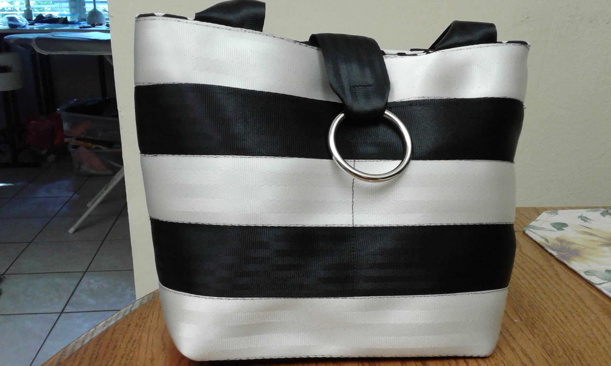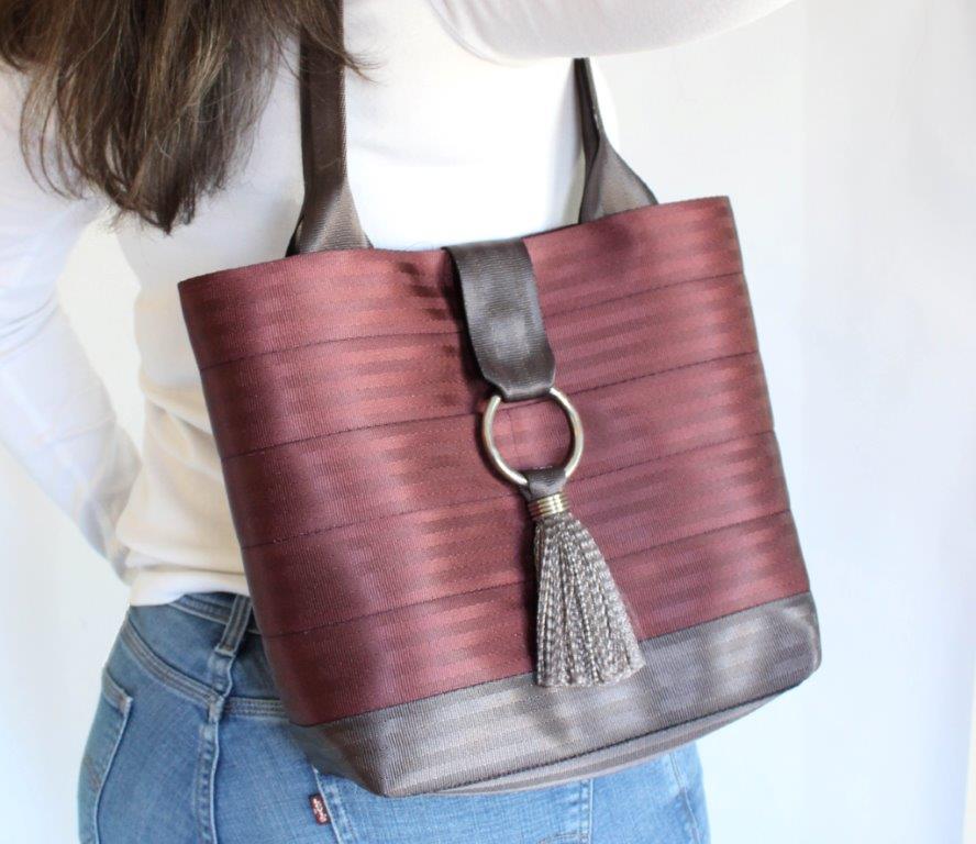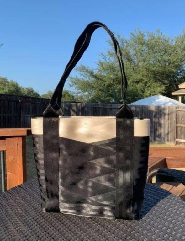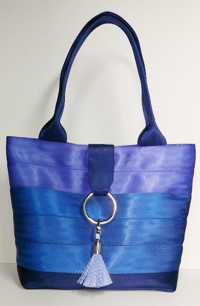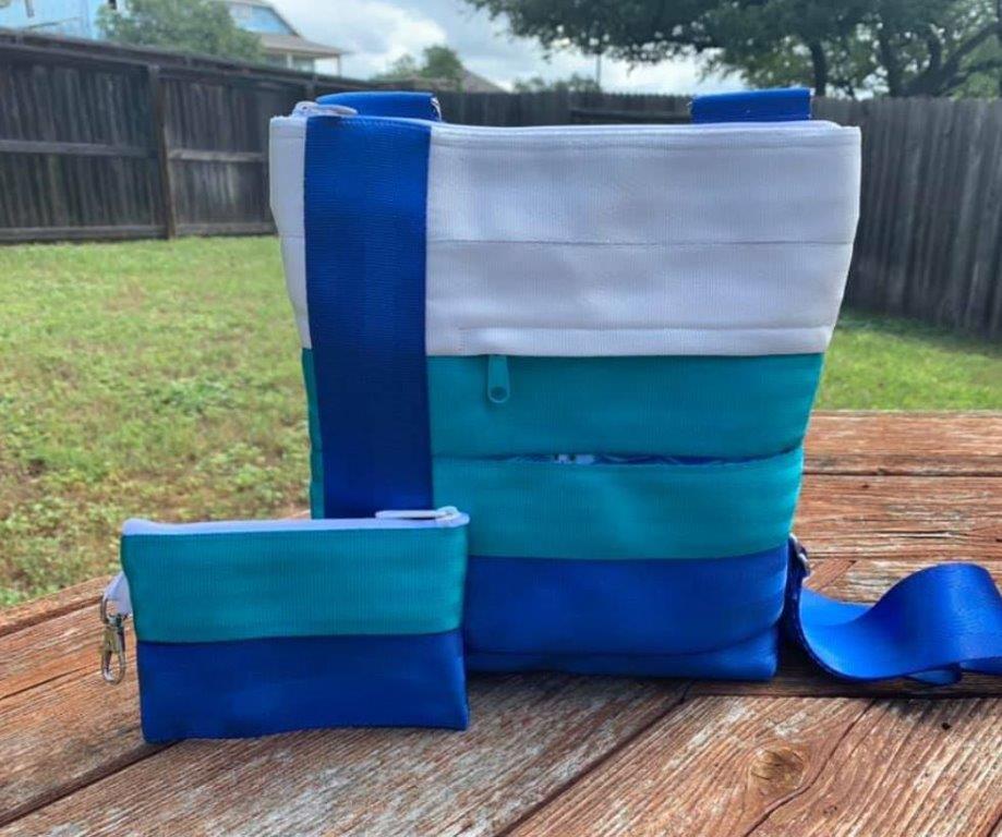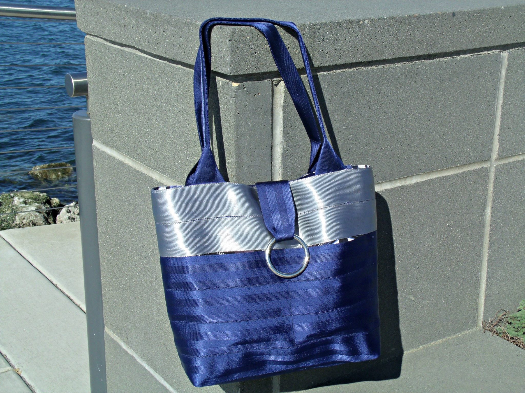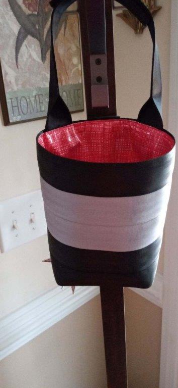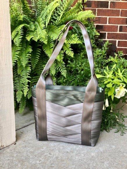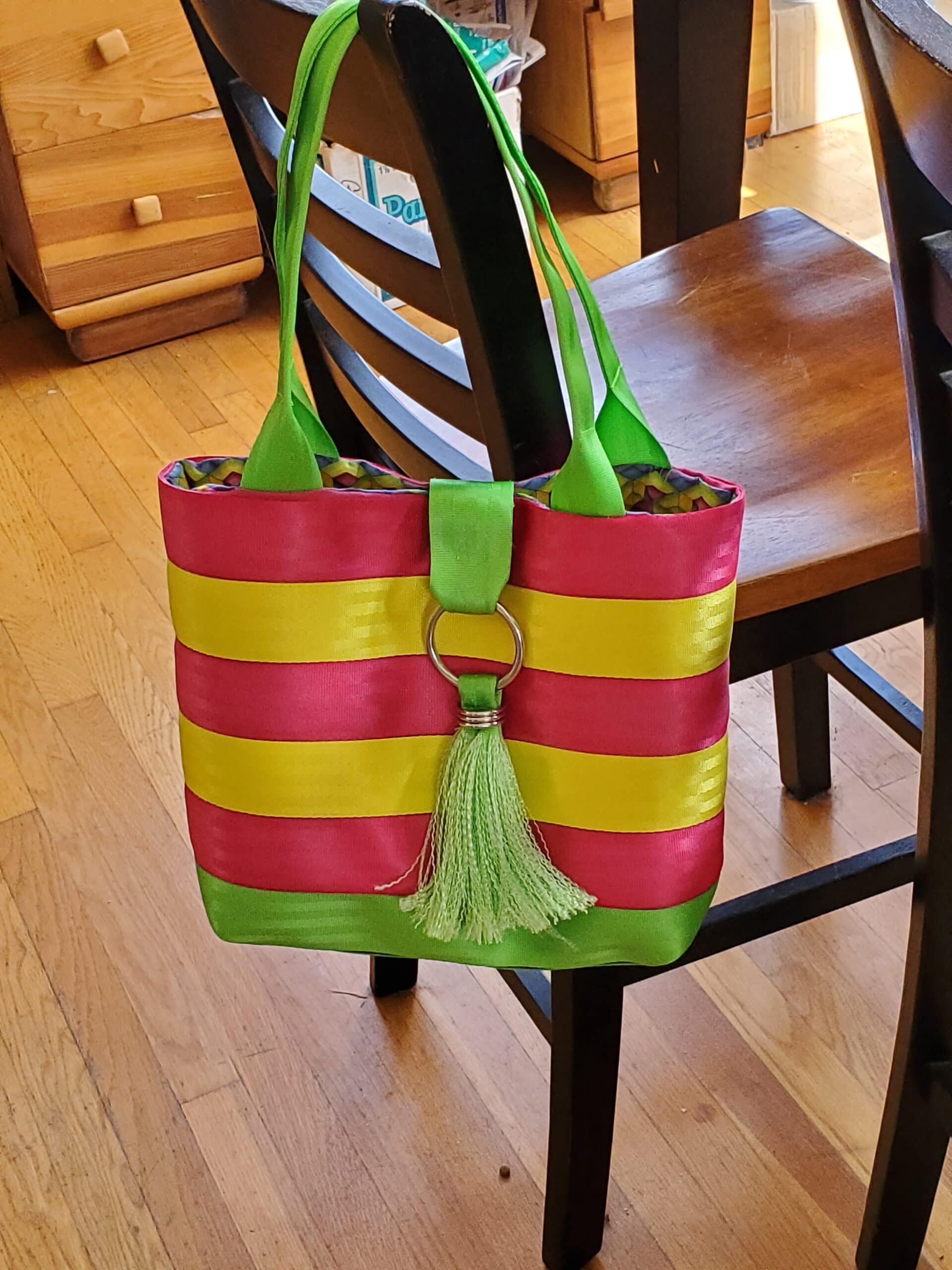 - Here’s Audrey and her very patriotic seat belt tote. Deep Red, snow & denim!