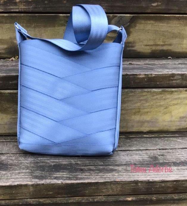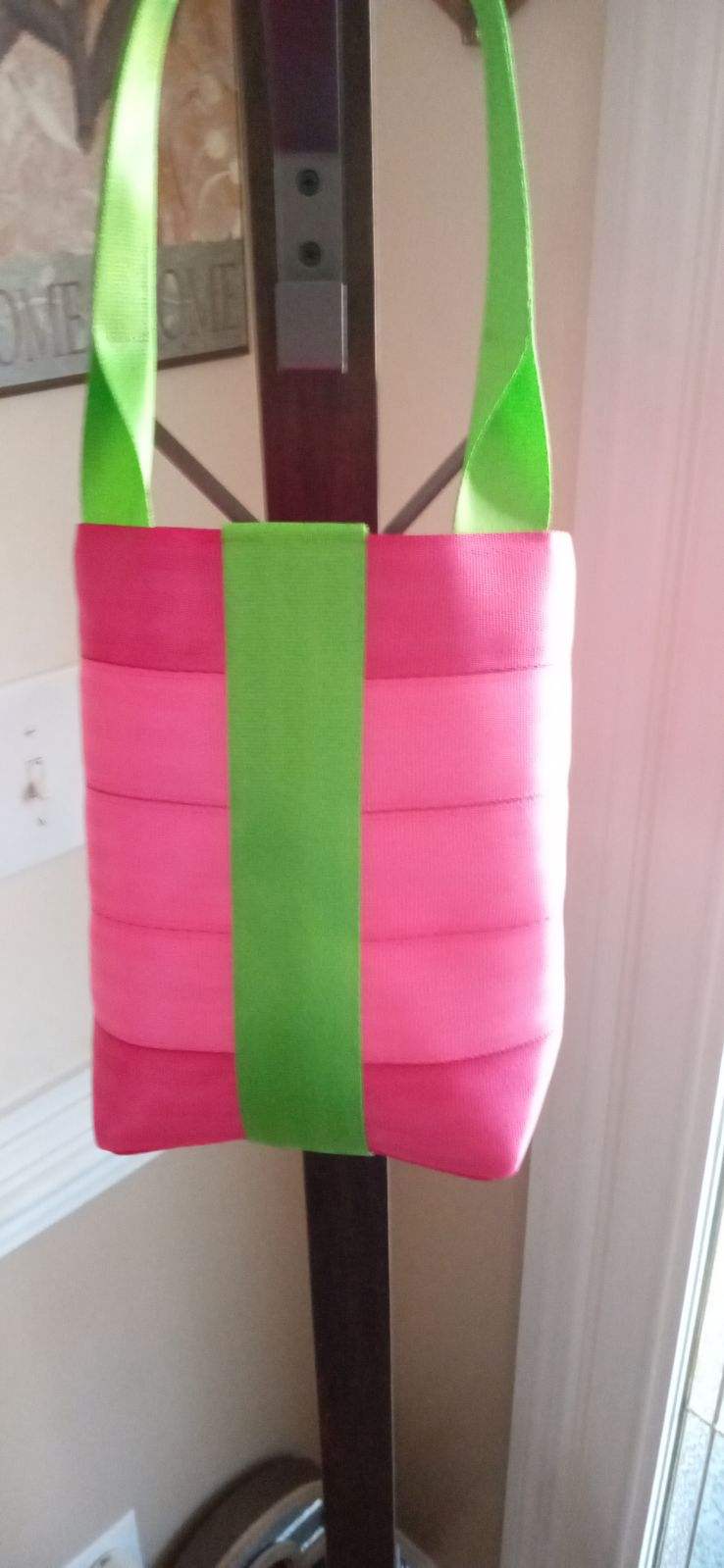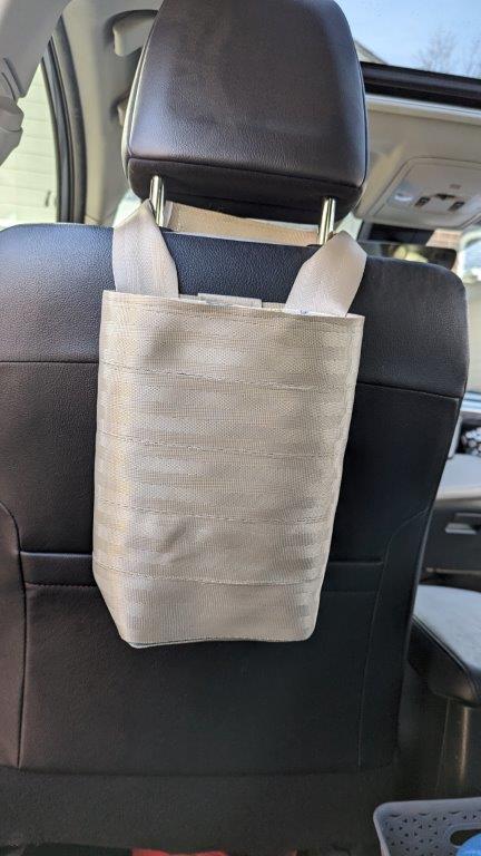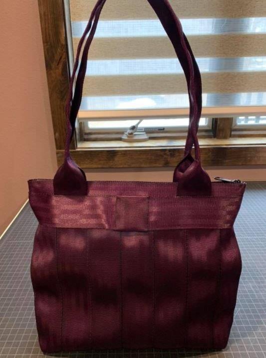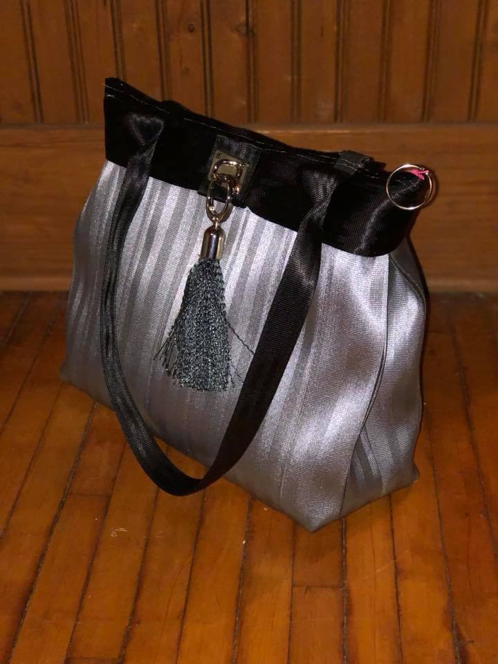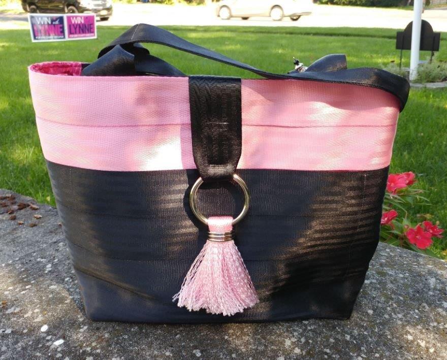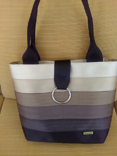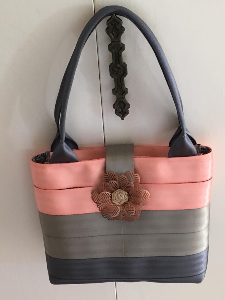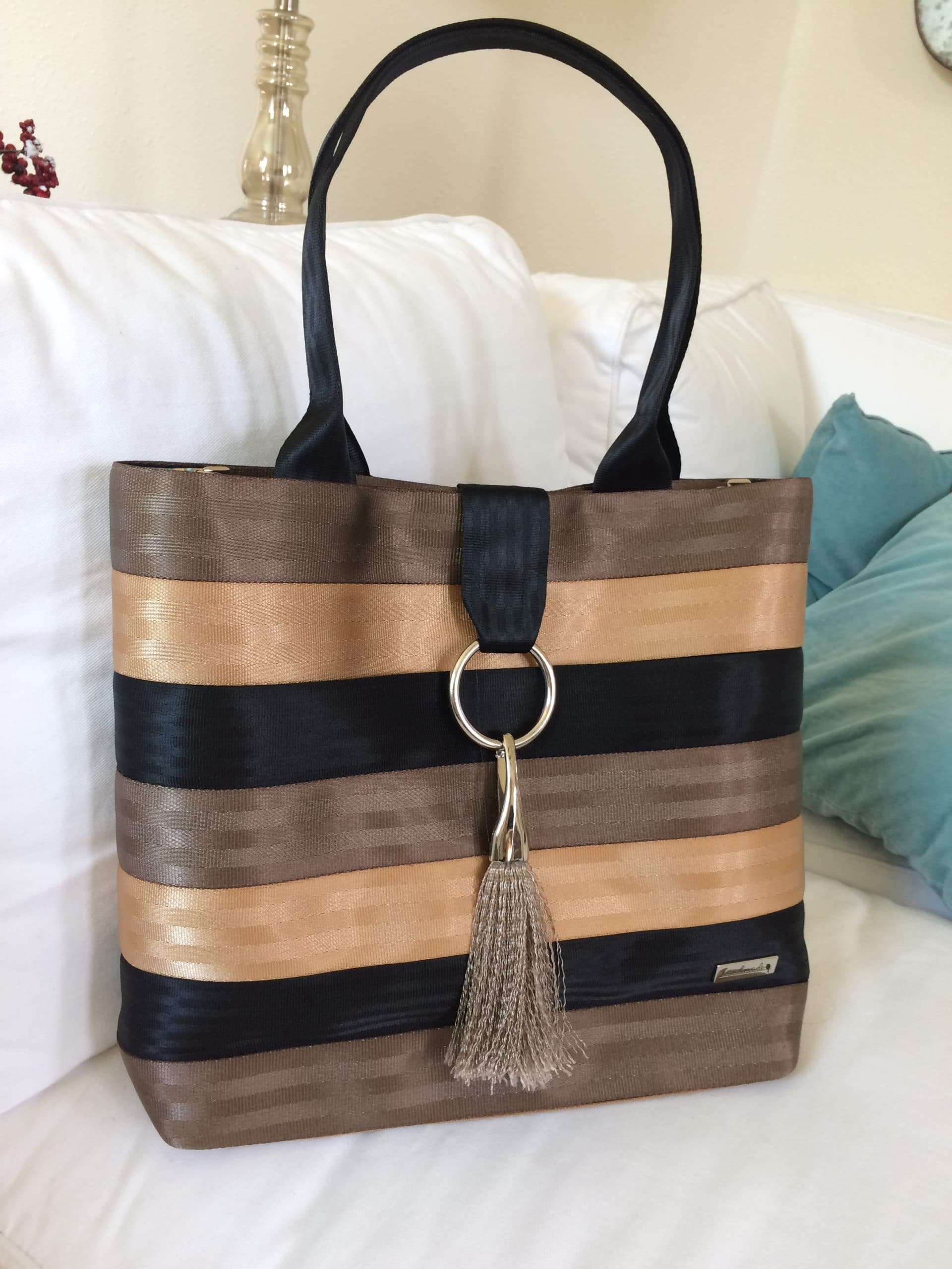 - Here’s Audrey and her very patriotic seat belt tote. Deep Red, snow & denim!