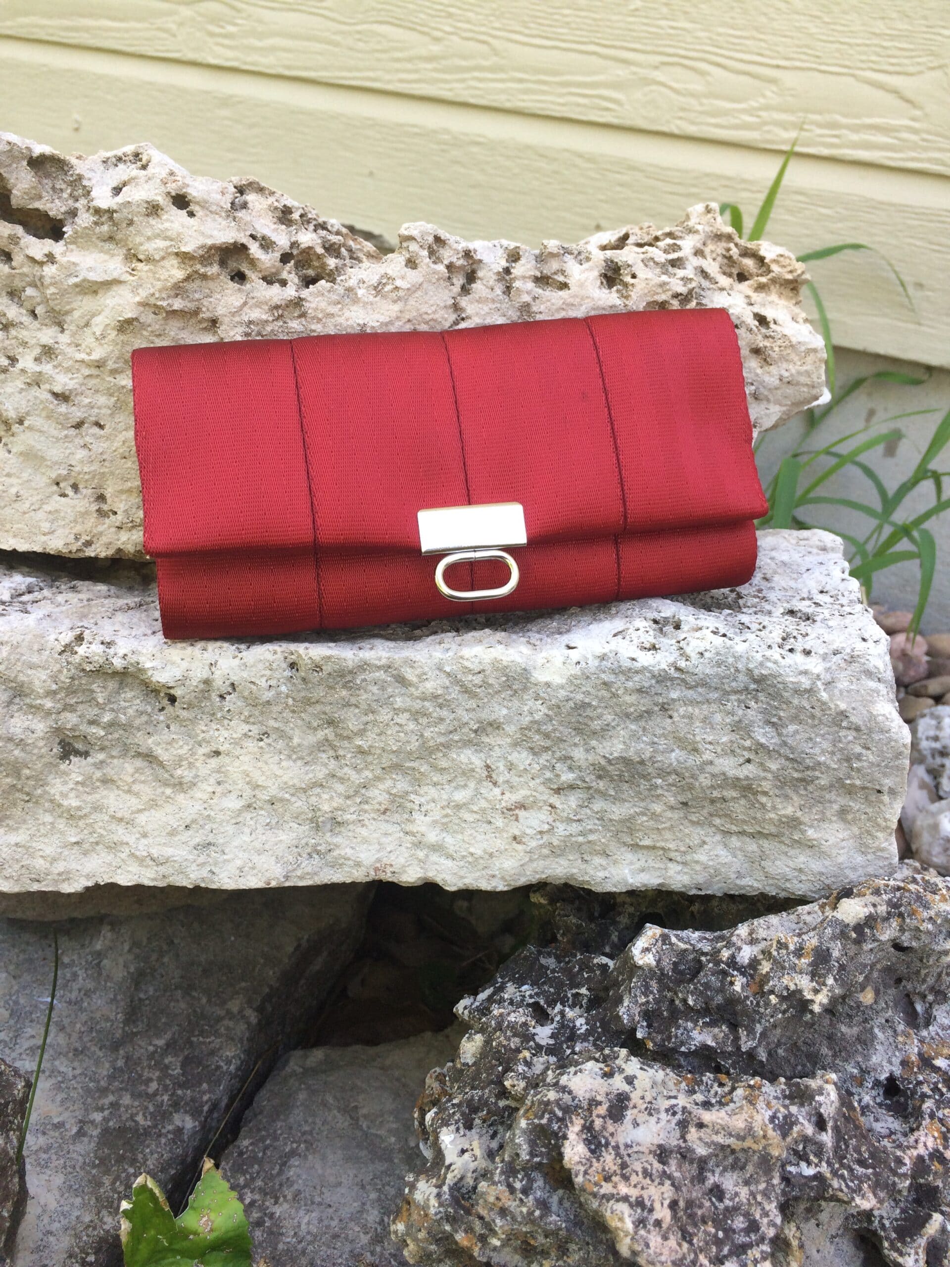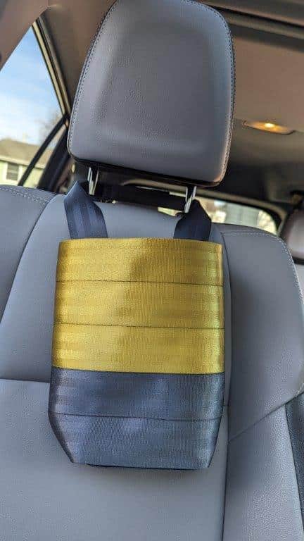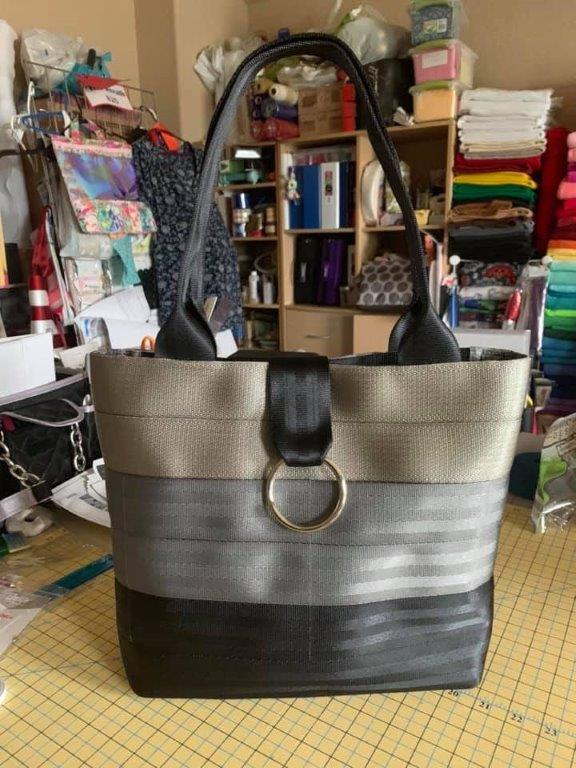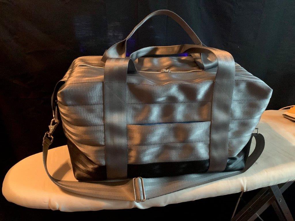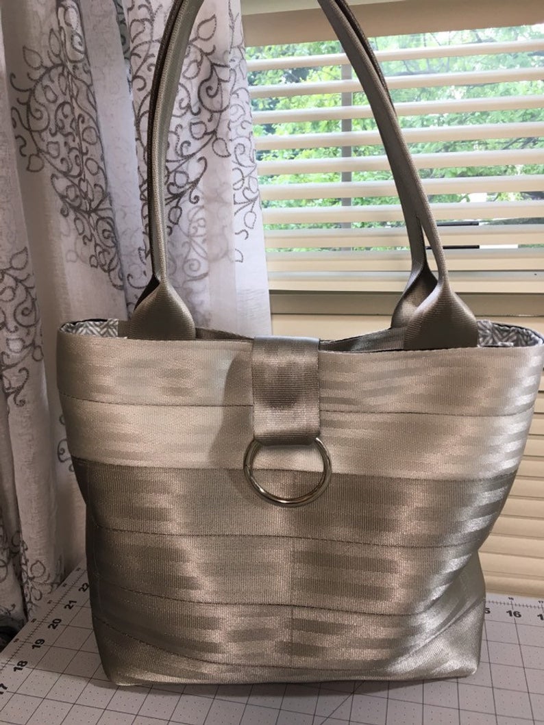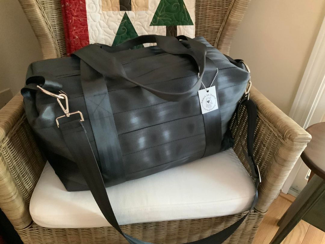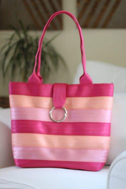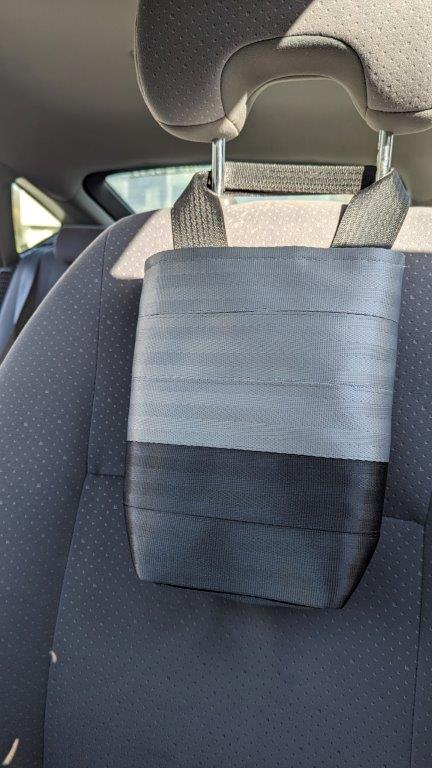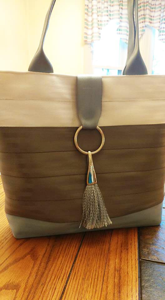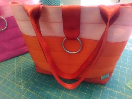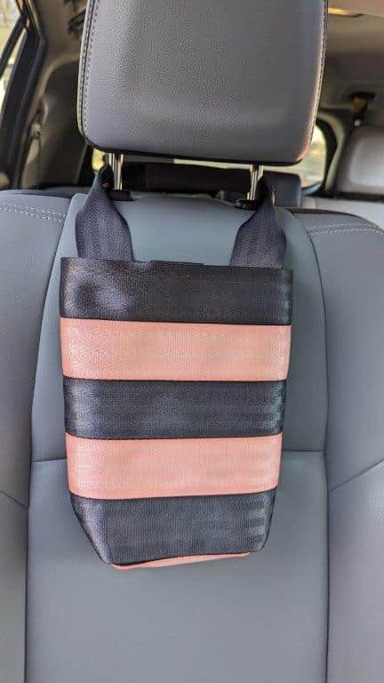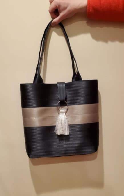 - Here’s Audrey and her very patriotic seat belt tote. Deep Red, snow & denim!
