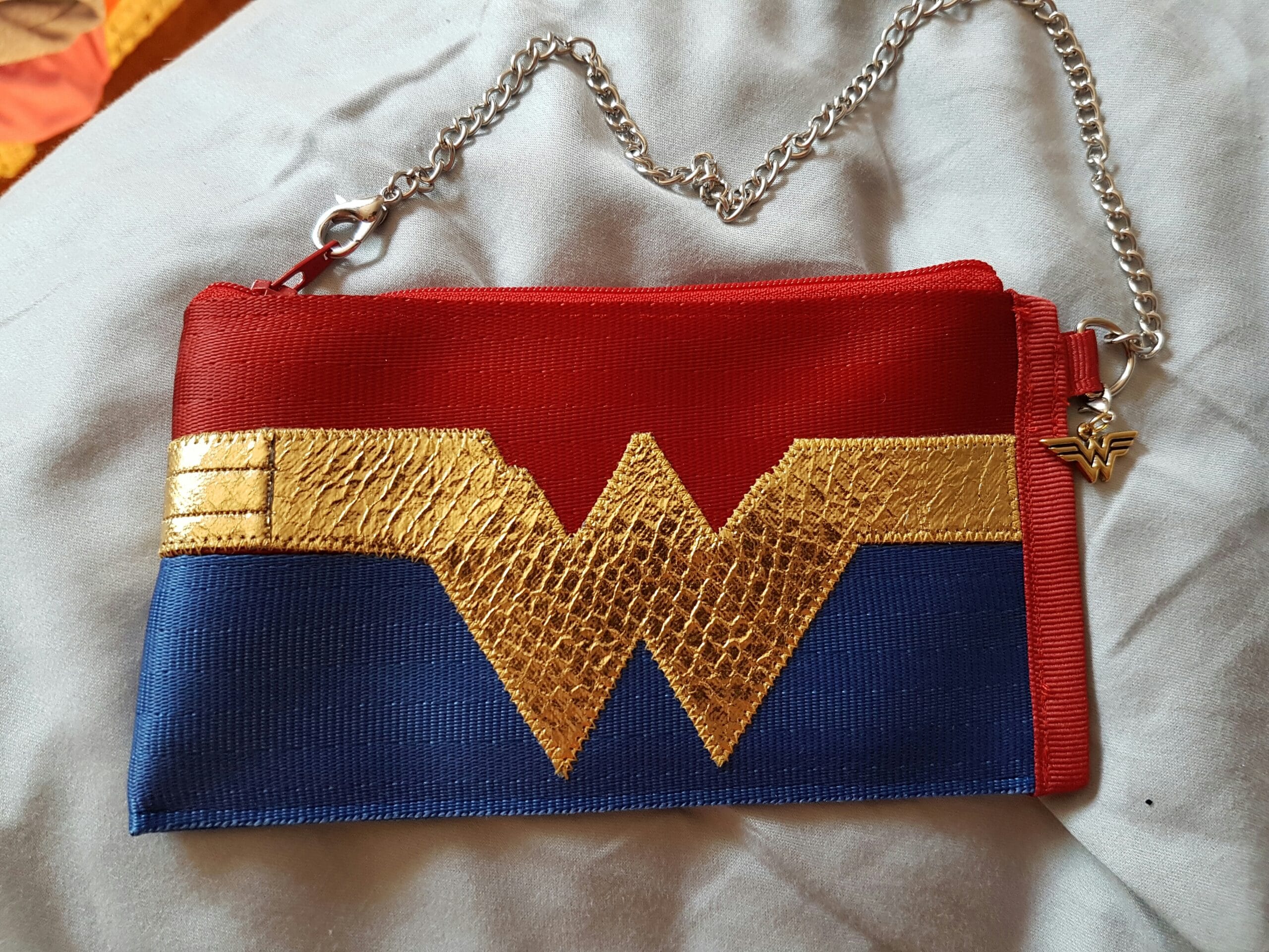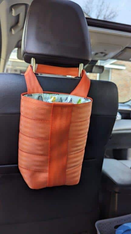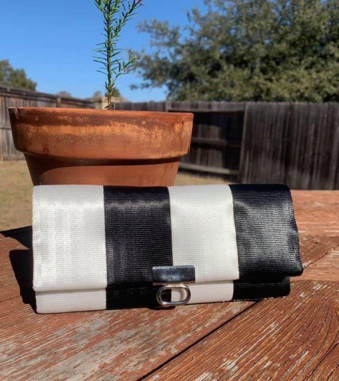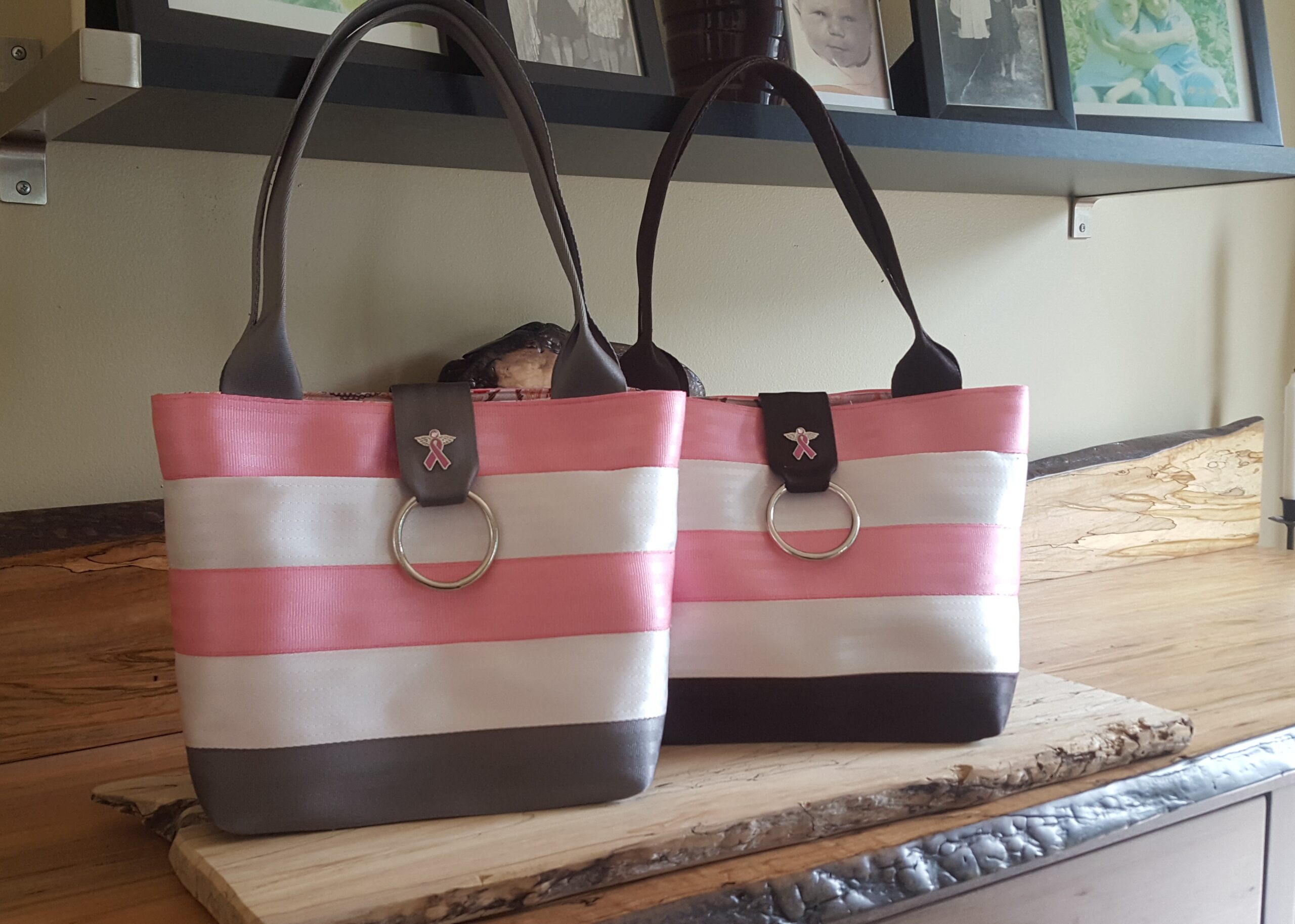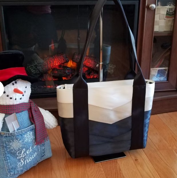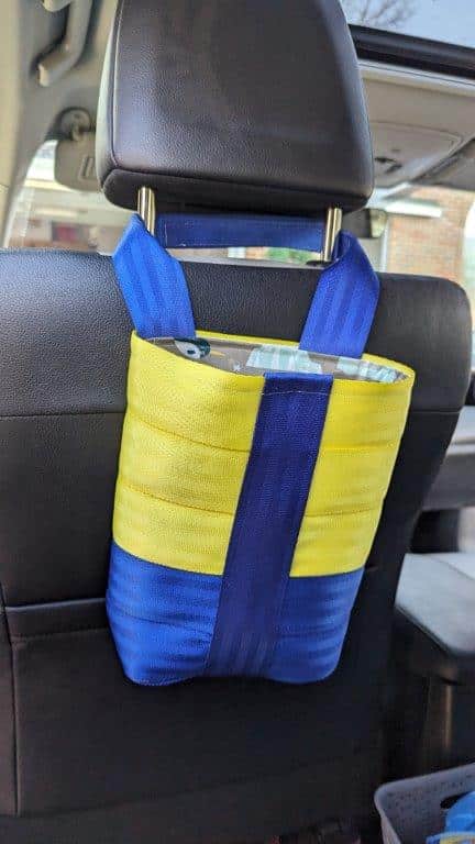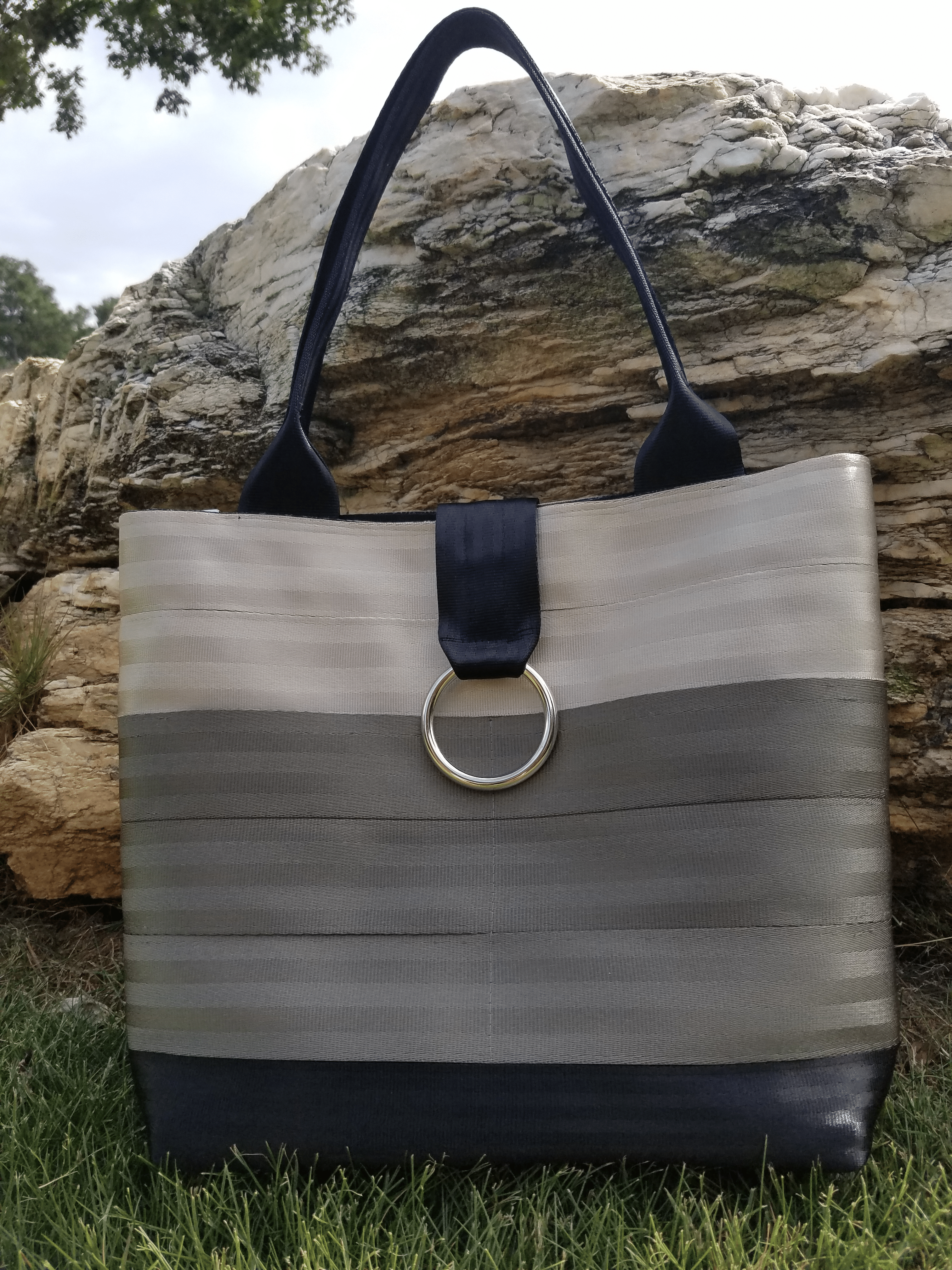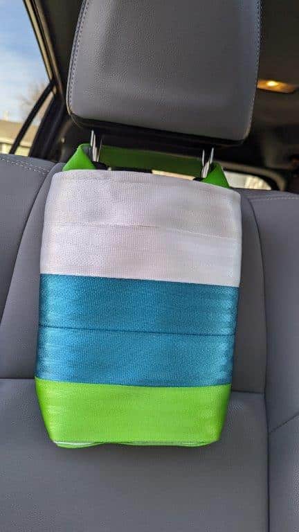 - Here’s Audrey and her very patriotic seat belt tote. Deep Red, snow & denim!