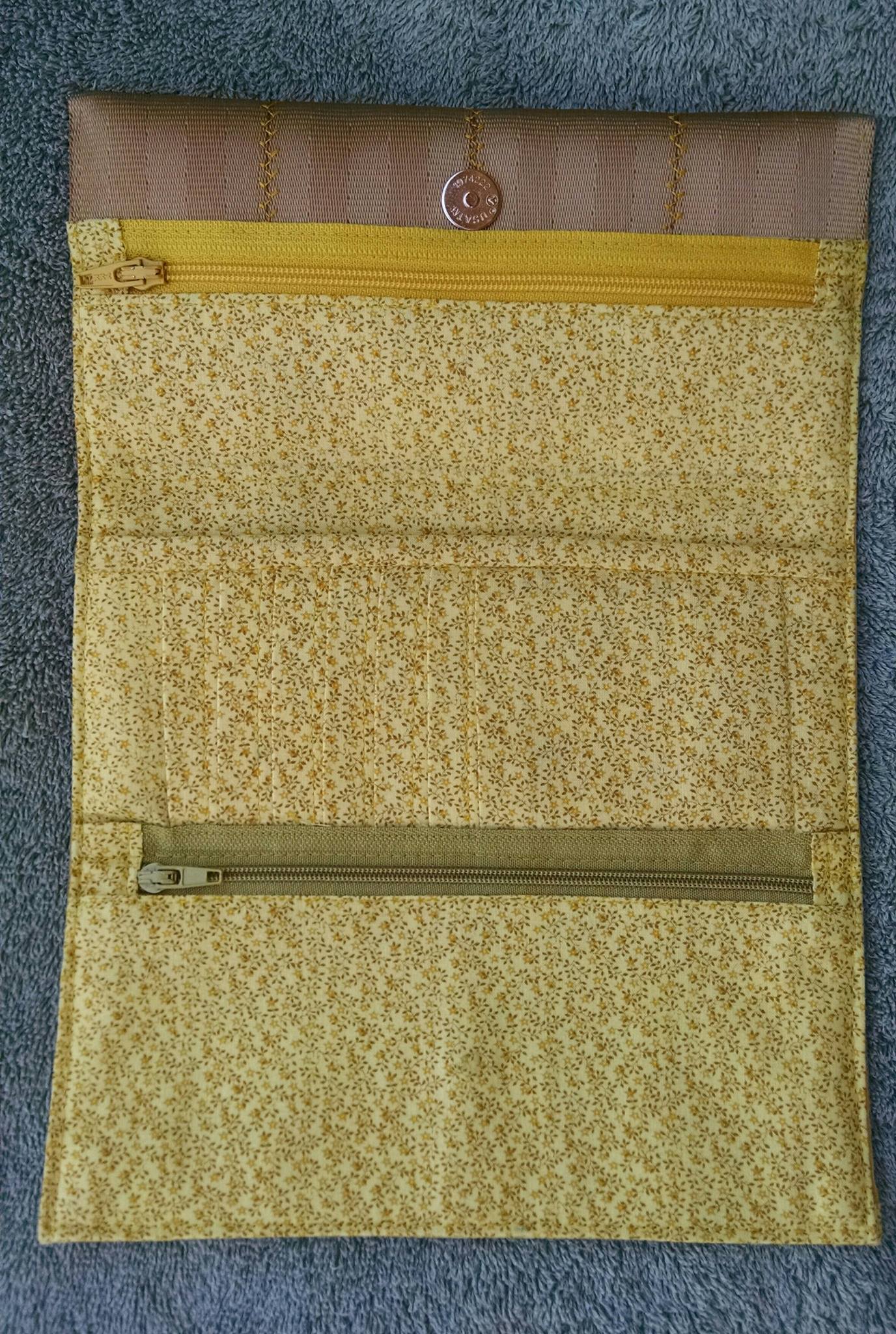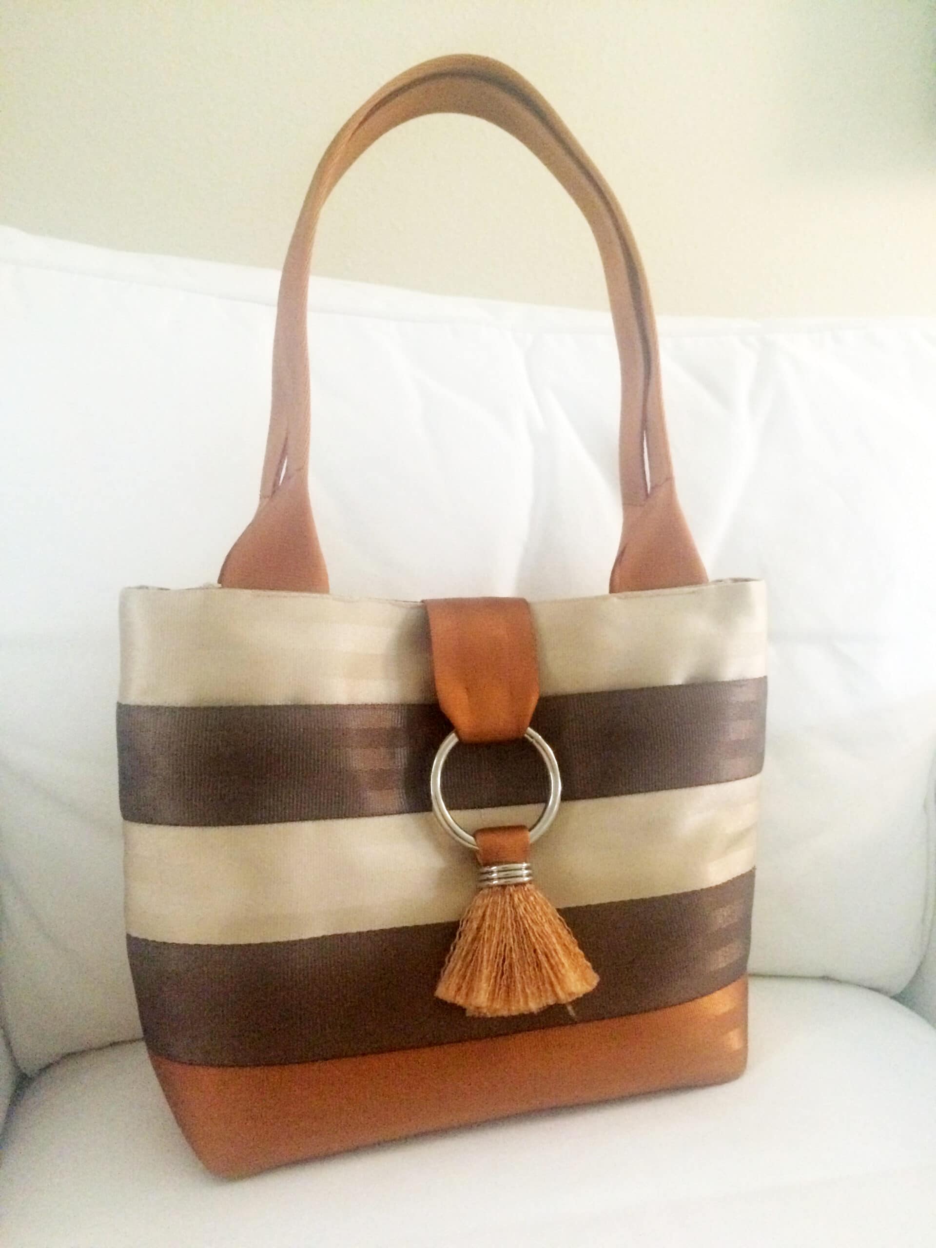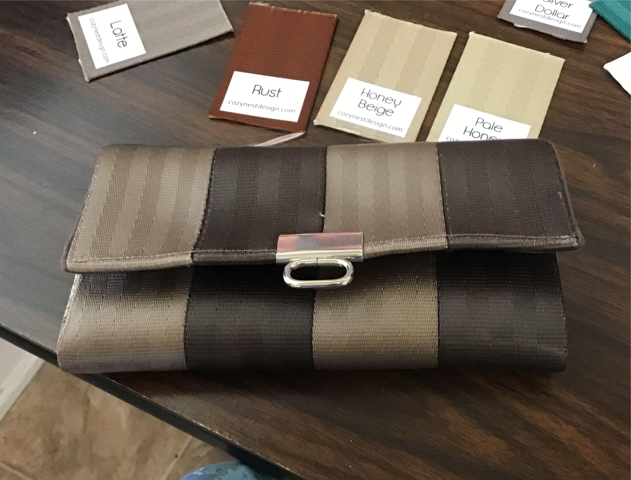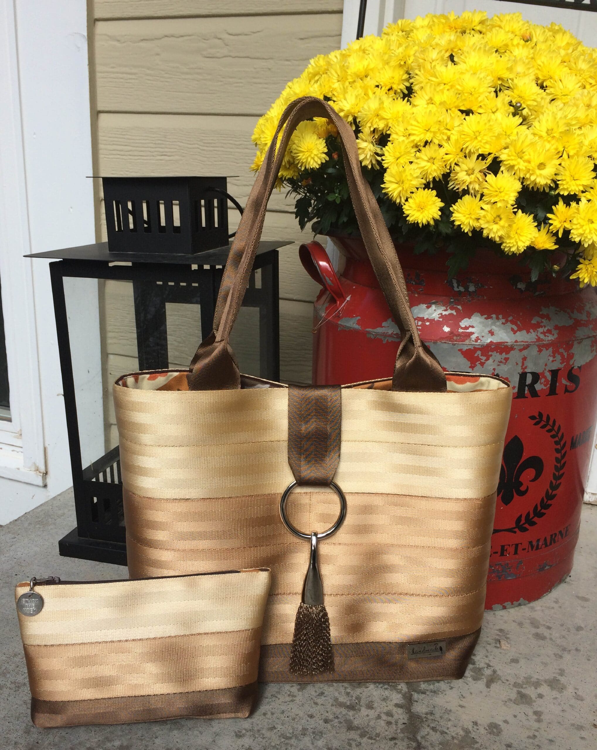 - medium in butter, copper and chocolate seat belt webbing with matching cosmetic bag!