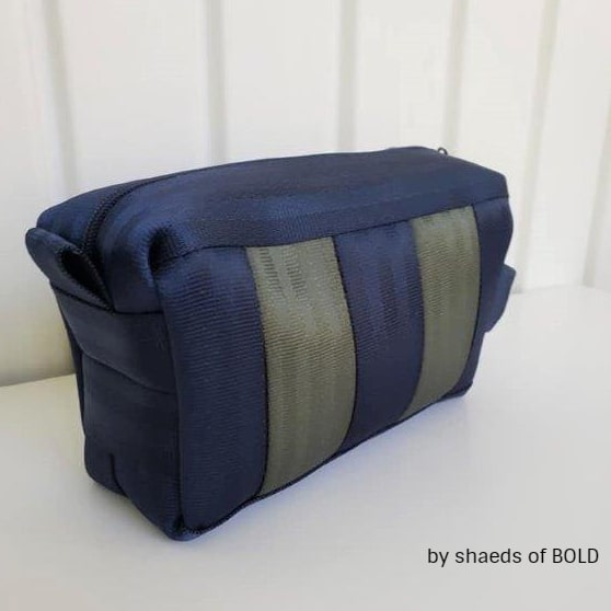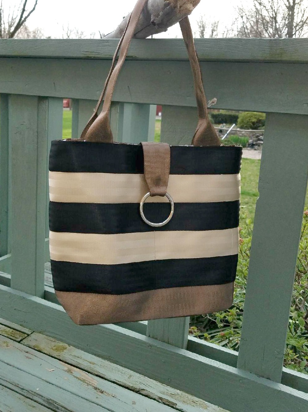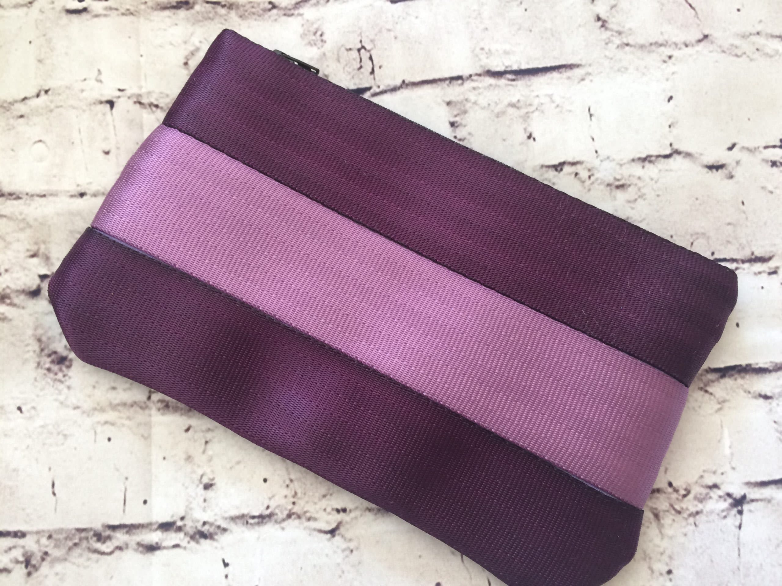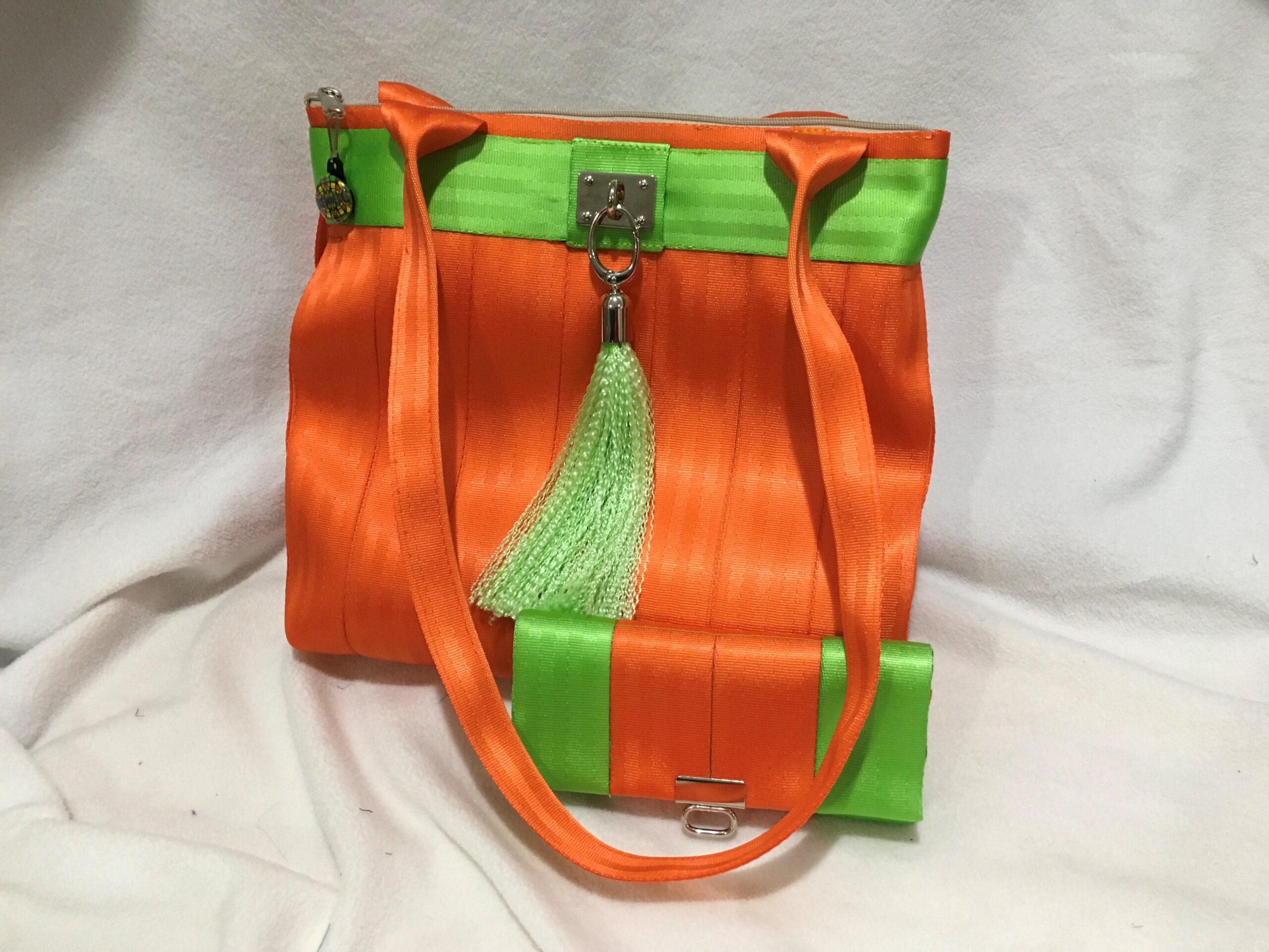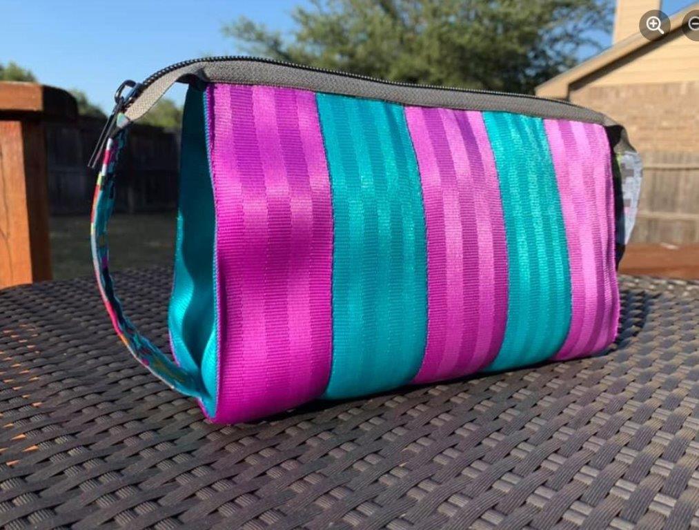 - medium in butter, copper and chocolate seat belt webbing with matching cosmetic bag!