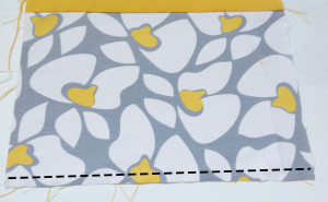Now lay your pocket right side up on the right side one of the Side Panels (I am using Side Panel C in this step). You want to align the bottom edges and the side edge of the pocket with the inner side edge of the cut-out. Sew the casing/elastic portion of the pocket with a regular stitch and then you can baste the rest of the pocket to the Side Panel.