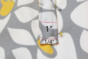 Now we are going to mark the handle for where we are going to stitch them on. Measure and draw a line 1/4″ up from the end of the handle and then draw another line 1″ up from the first. It occurs to me as I am writing this that marking this handle would be easier before you pin it to the Side Panel – how many of these have I made? I guess there is always room for improvement! In any case, repeat that the handle ends.