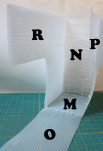 The next step is to attach M and O together along their short ends. These are the pieces that make up the whole bottom and back side of the basket.